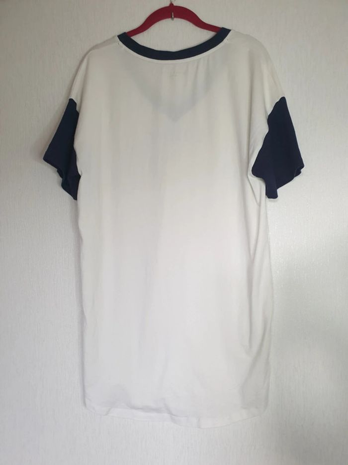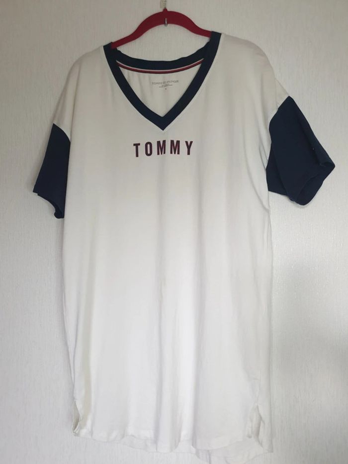Chemise de nuit blanche avec manches bleu marine, écriture devant, arrive au dessus du genou, coupe regular fit Tommy hilfiger, taille S Coton et élasthanne A noter : taché devant (voir photo) Prix d'achat : 49€ #pauliiiinefemme36