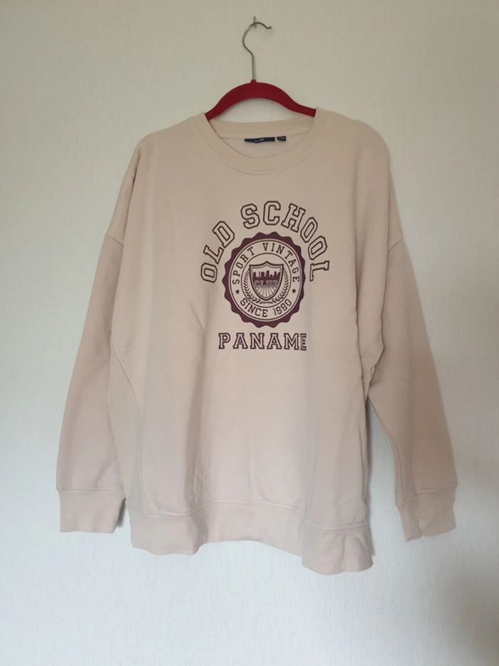 Sweat beige, old school, coupe ample, polaire a l'intérieur Kiabi, taille L (42/44) Polyester et coton Porté quelques fois Aisselle : 70 cm Longueur : 67 cm #pauliiiinefemme42