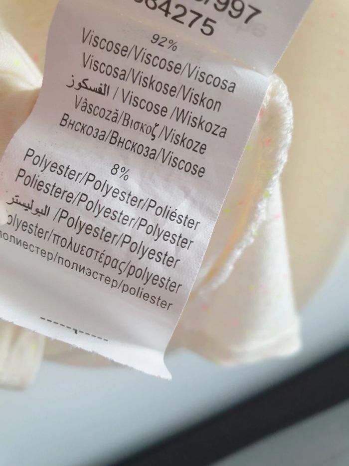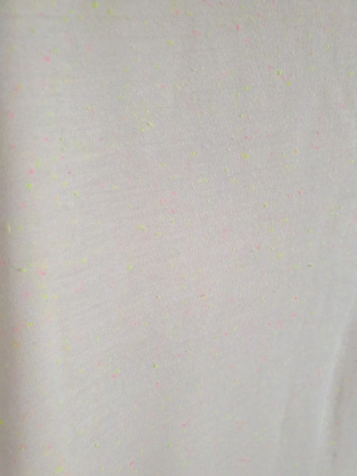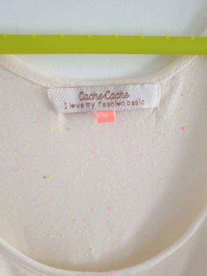Débardeur blanc cassé, jaune pale, moucheté rose et jaune fluo, légèrement transparent Cache cache, taille 4 Viscose et polyester Peu porté #pauliiiinefemme42