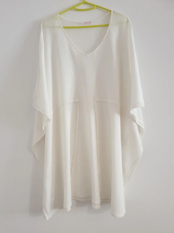 Blouse, tunique, robe de plage, manches chauve souris, courtes voire 3 quart, col V, lien a resserrer à la taille, broderie aux manches, légèrement transparent, peut se porter par dessus un maillot de bain, fine maille Camaieu, taille unique Étiquette coupée Porté 2 fois Longueur : 86 cm environ #pauliiiinefemme40 #pauliiiinefemme42 #pauliiiinefemme44 #pauliiiinefemme46