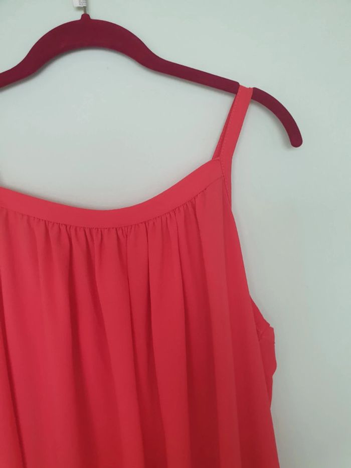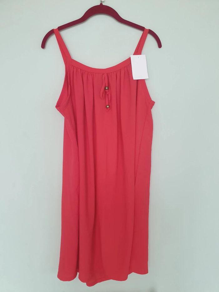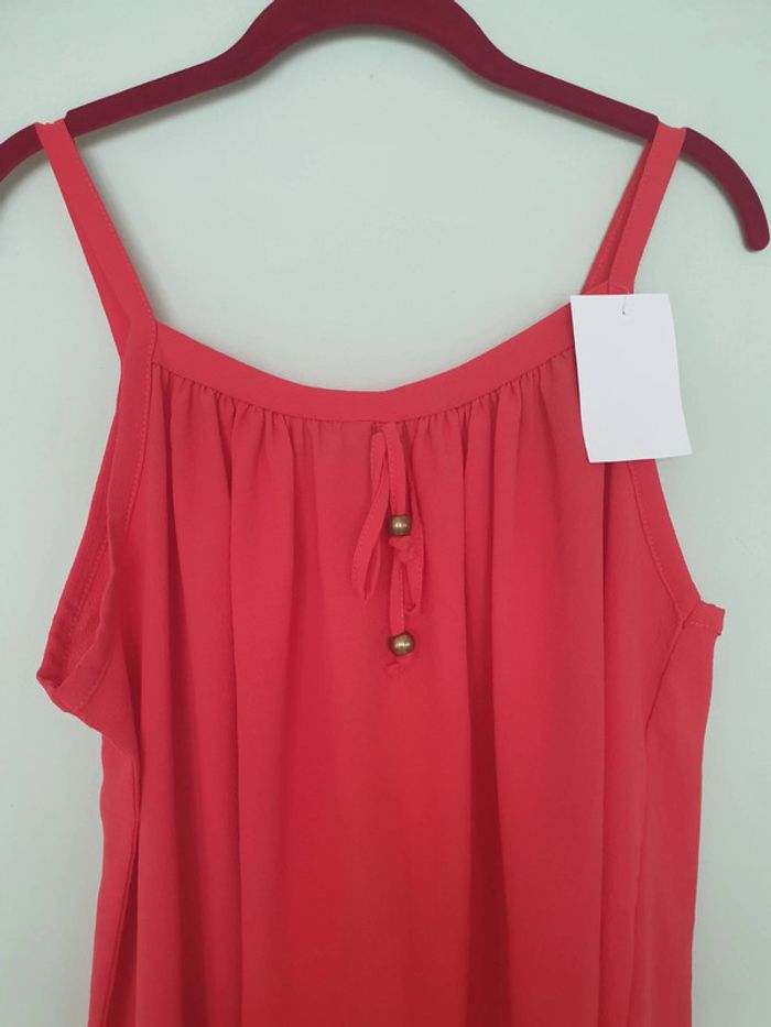 Robe tunique couleur rouge corail, sans manches, bretelle, lacet en déco sur le devant avec perle, coupe large, idéal pour l'été Taille unique, je suppose plutôt pour un 42 Fabriqué en France, 95% polyester, 5% élasthanne Neuf avec étiquette Aisselle à aisselle : 54 cm #robefemme #tuniquefemme #pauliiiinefemme42