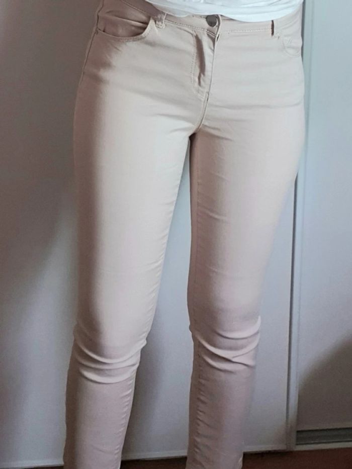 Pantalon skinny beige, 7/8eme, arrive au niveau de la cheville (pour 1m65), taille mi haute, jeans, bragette à zip, tissu léger, idéal pour la mi saison Cache Cache, taille 34 Étiquette coupée Porté rarement #pauliiiinefemme34