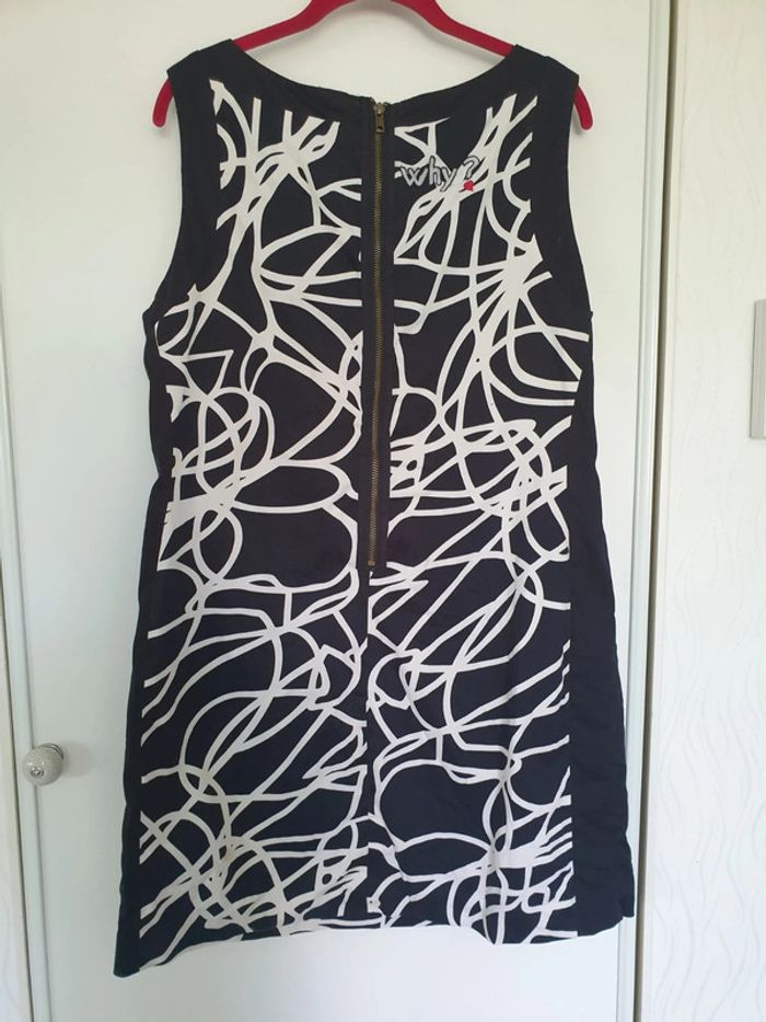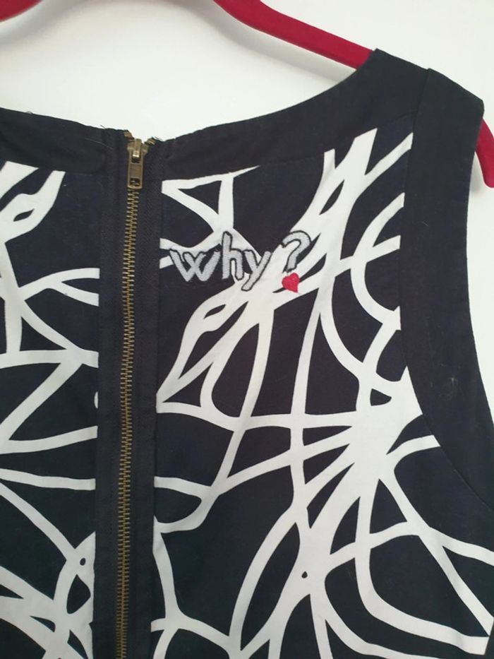 Robe, noir et blanc, empiècement coeur brodé devant avec motif fleur, fil argenté, motifs blancs sur fond noir façon gribouillage, coupe cintrée, long zip dans le dos, inscription "Why ?" brodée avec un mini coeur rouge 98% Coton et 2% élasthanne, doublure intérieure noire 100% polyester Étiquette coupée donc je ne sais pas vraiment la taille, je pense du L Référence DESIGUAL : 47V2807 LUDER Prix neuf : 124,00 € Porté quelques fois A noter : petite tache a l'arrière Longueur : 88 cm Aisselle : 53 cm #pauliiiinefemme38 #pauliiiinefemme40 #pauliiiinefemme42