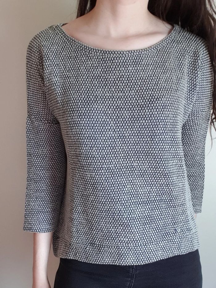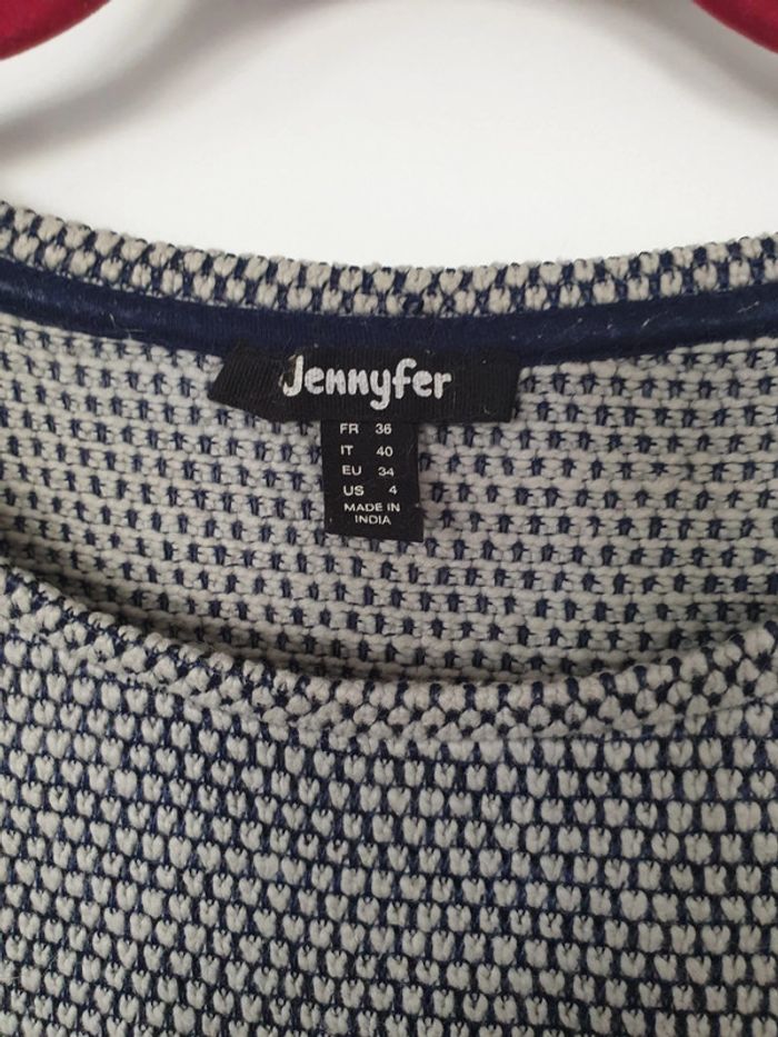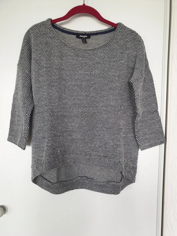 Petit pull fin, manche 3/4, bleu marine et gris/blanc, col rond, base arrondie derrière, plus long derrière que devant, coupe ample Jennyfer, taille 36 Coton et polyester Peu porté Aisselle à aisselle : 51 cm #pulljennyfer #pullfemme36 #pullbleu #pauliiiinefemme36