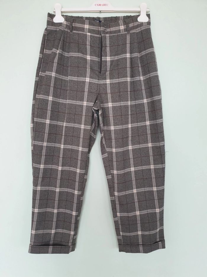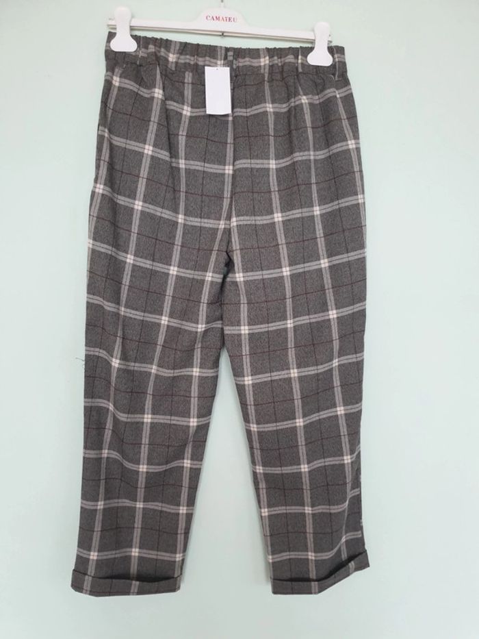 Pantalon droit de ville, à carreaux gris, blanc et liseré marron / bordeaux, taille haute, ourlet cousu, 2 pinces devant, braguette 2 boutons et fermeture éclair, 2 poches avant, ceinture élastique, passant pour mettre une ceinture Kiabi, taille 44 98% polyester, 2% élasthanne Entrejambe : 64 cm Taille à plat : 40 cm Bas de la jambe : 20 cm Longueur taille / cheville : 96 cm #pantalonfemme #pantalonacarreaux #pauliiiinefemme44