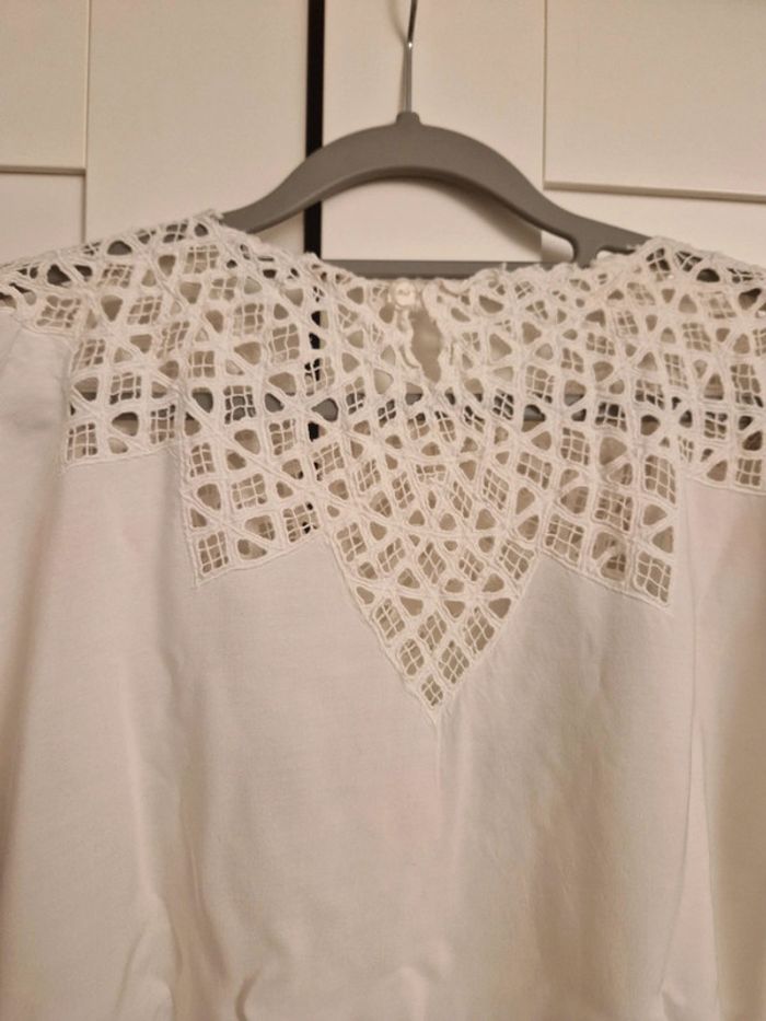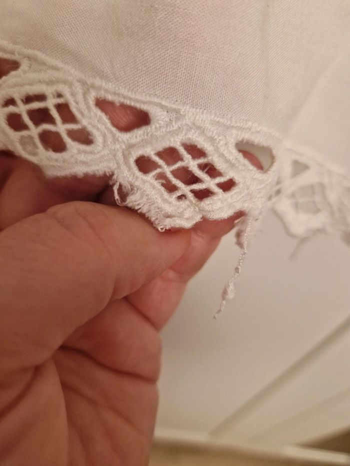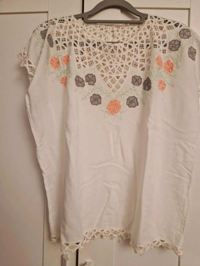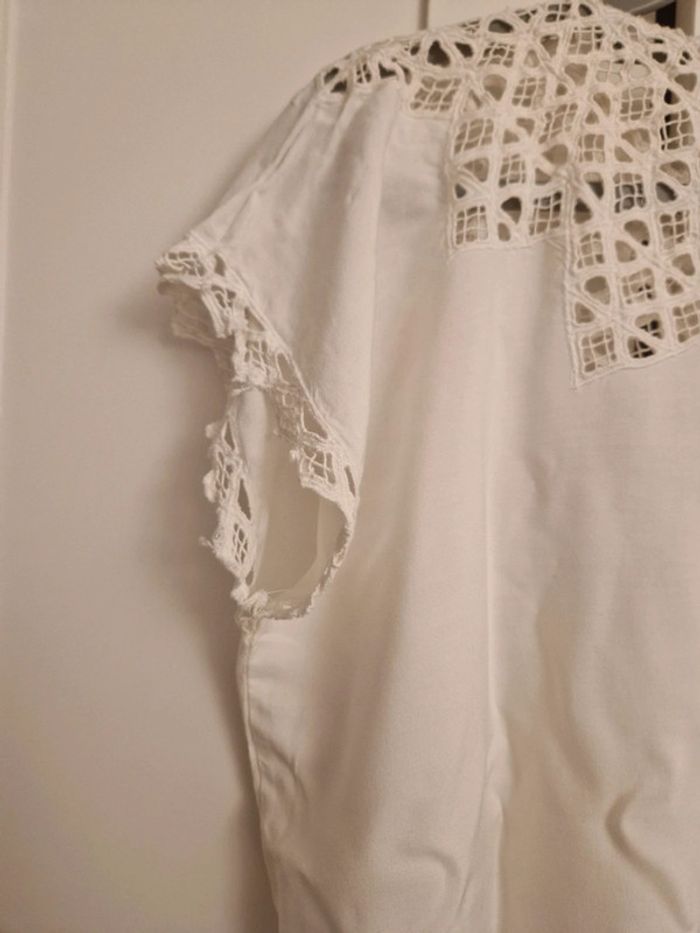 Magnifique blouse à manches courtes avec dentelle et fleurs brodées. Très bon état général mais petits accros au niveau du liseré dentelé en bas (cf photo) Taille 42/44 Matière fluide très agréable (viscose)