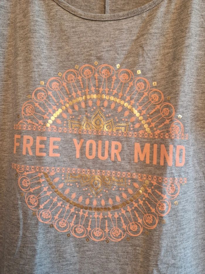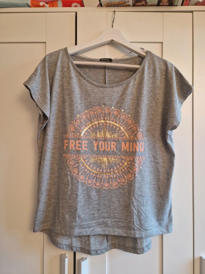 Magnifique t-shirt Gémo, gris clair chiné, avec motif Corail et doré du plus bel effet! Taille S (coupe ample) Neuf sans étiquette Matière fluide et agréable