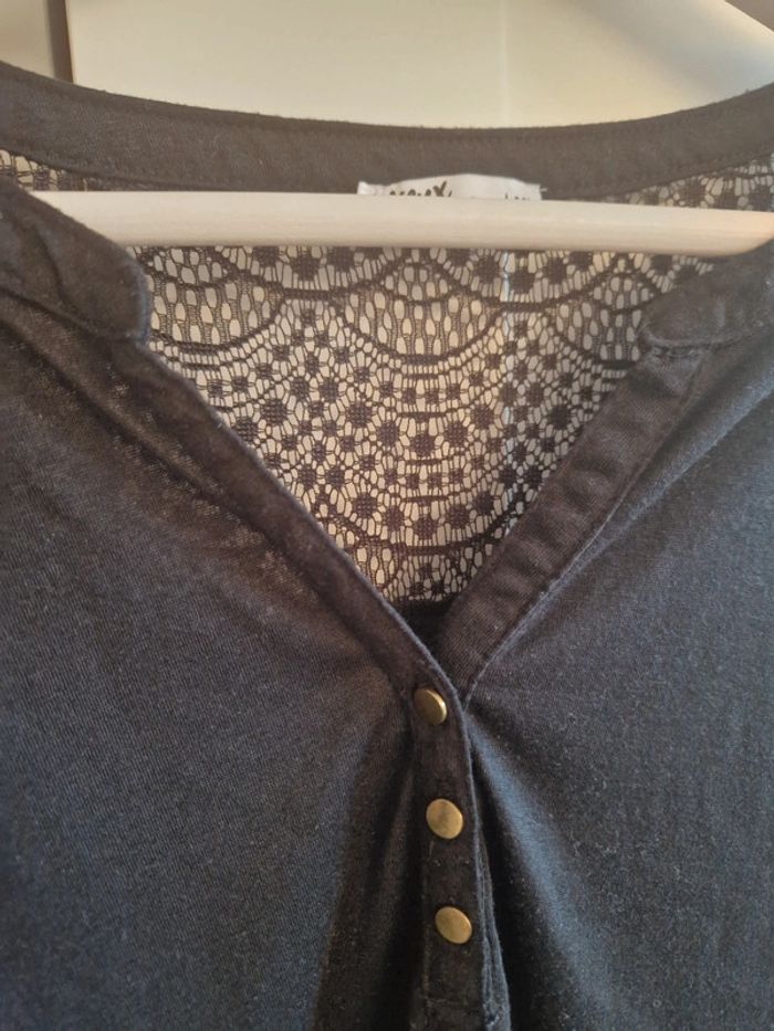 Élégante blouse noir, avec petits boutons dorés, Gémo, taille XL en très bon état Manches ajustables 3/4 Empiècement dentelle au niveau du haut du dos pour la touche très féminine. Matière fluide et agréable