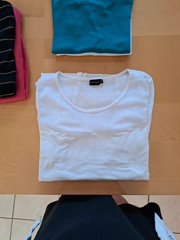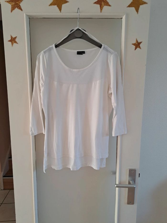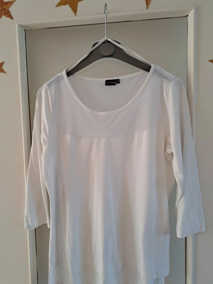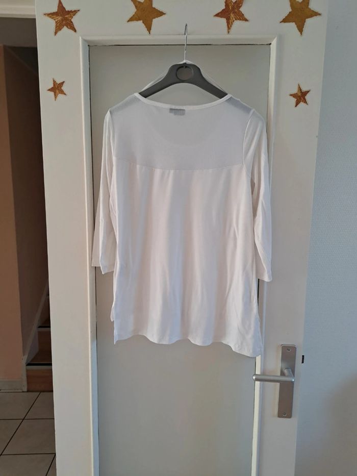 T-shirt blanc avec haut en tulle ,manches 3/4, devant plus court que le dos En très bon état Envoi rapide et soigné . D'autres vêtements femme en vente #isacorbasfemme