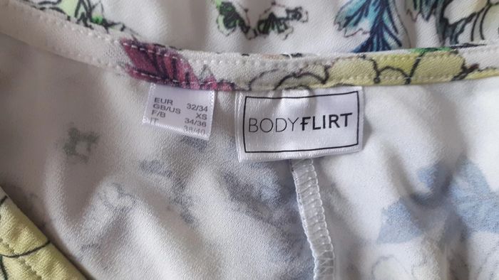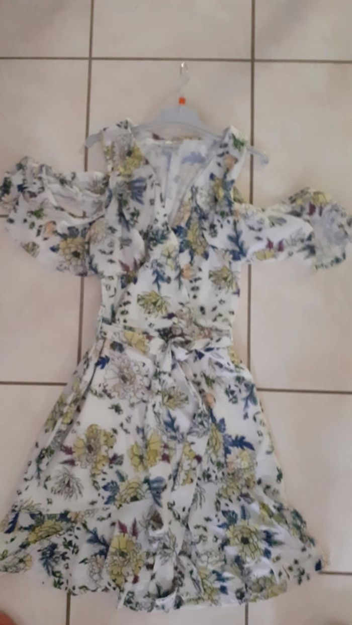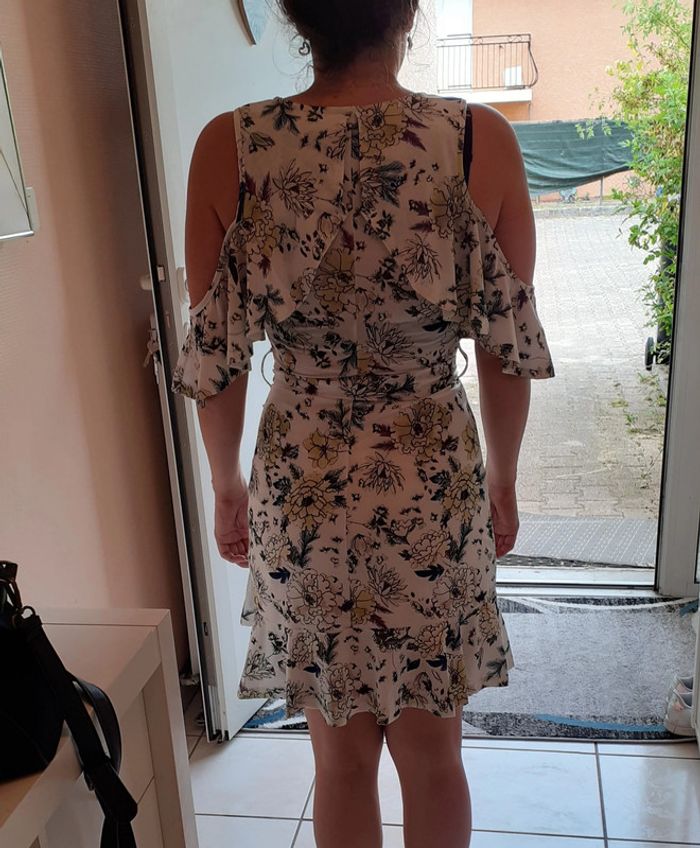 Très jolie robe au motif et à la découpe originale en très bon état. Taille 34/ 36. 95 % en polyester 5 % elasthane