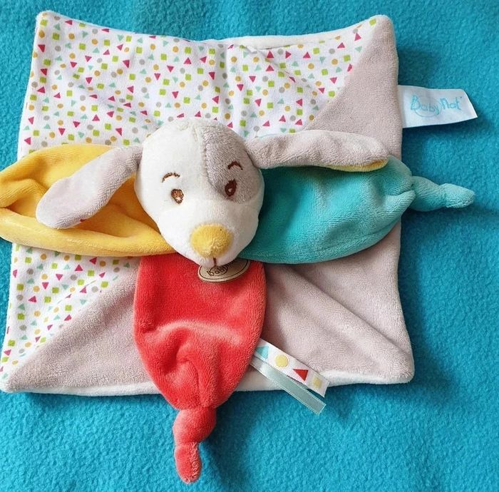 DOUDOU CARRE PLAT EN VELOURS DE COULEUR BEIGE ET TISSU BLANC AVEC IMPRIME AU CENTRE DU DOUDOU, TETE DE CHIEN DIABLOTIN AVEC INTERIEUR DES OREILLES EN TISSU IDENTIQUE AU CARRE PLAT 3 PETALES JAUNE, BLEU ET ROUGE AUTOUR DU COU ETAT PARFAIT !