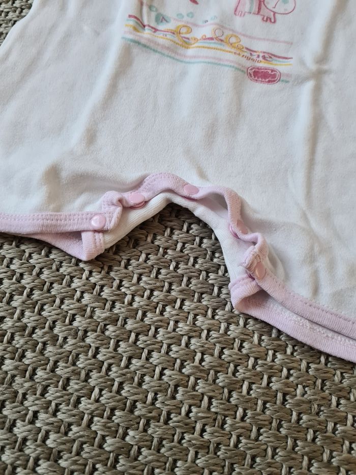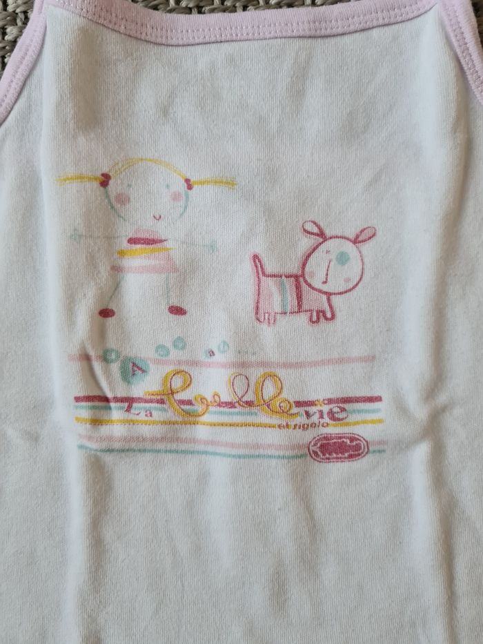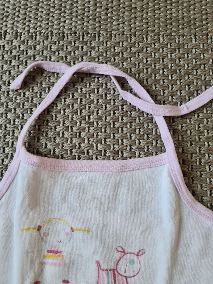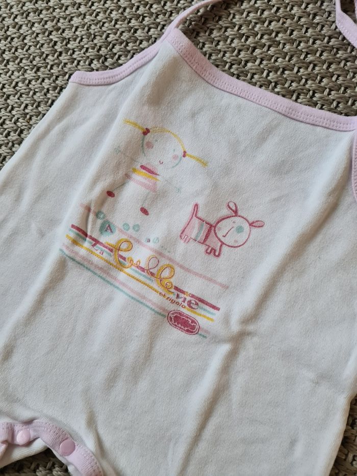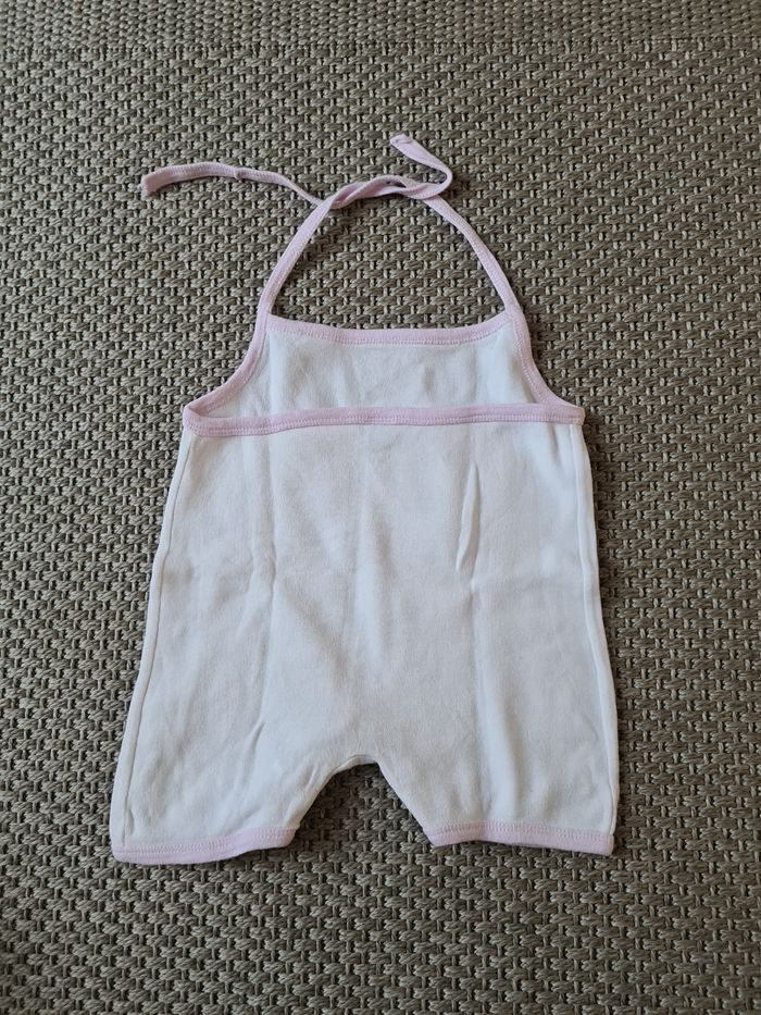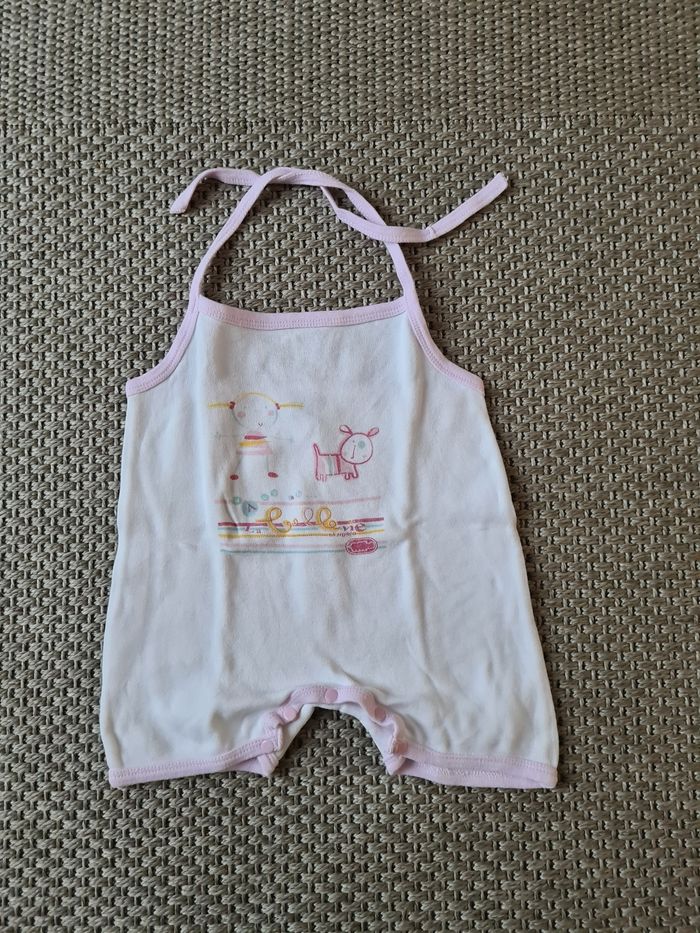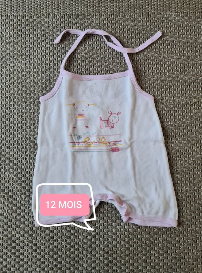 bodie short sans manche avec bretelle en tour de cou en bon état. Boutons à pressions pour le change. Tres léger il est Idéal pour l'été. Taille 12 mois - 100% coton