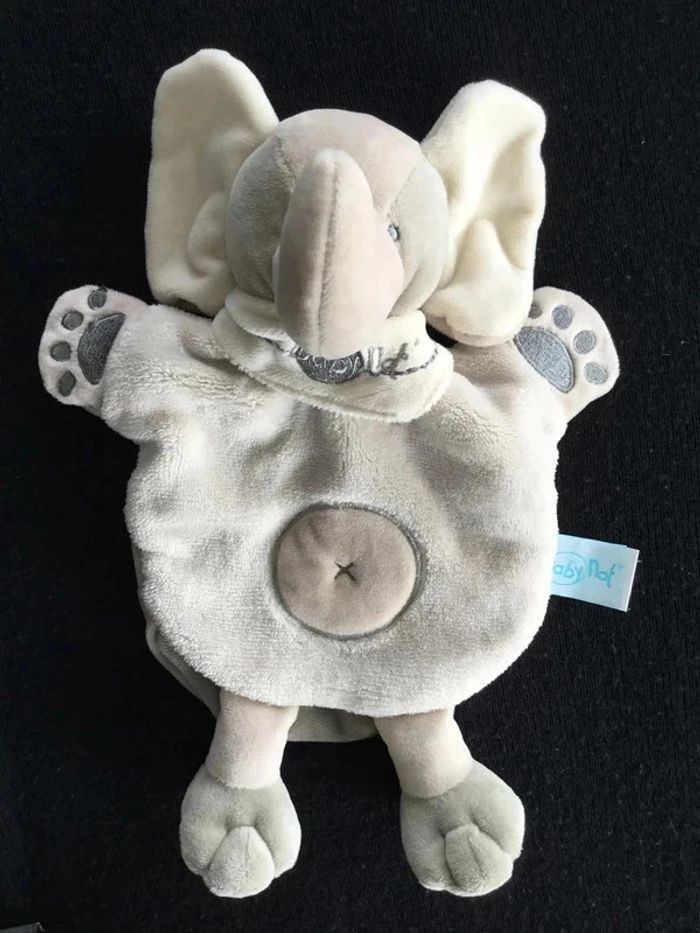 DOUDOU MARIONNETTE ELEPHANT SAVANE EN VELOURS DE COULEUR GRIS ET ECRU TETE PELUCHE ELEPHANT SUR LE HAUT DU DOUDOU AVEC BANDANA AUTOUR DU COU AVEC INSCRIPTION BABY NAT SUR LE DEVANT, UN ROND AVEC CROIX AU CENTRE EN GUISE DE NOMBRIL TRES DOUX AU TOUCHER IDEALE POUR RACONTER ET MIMER DES HISTOIRES ETAT NEUF !