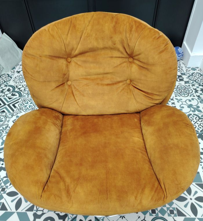 Fauteuil Design Pivotant 360° Gabin Haut de gamme en velours de couleur Moutarde. Doté de coussins cocooning et enveloppant (idéal pour l'allaitement) et d'un pied en métal chromé. Dimensions : Largeur : 86 X Hauteur : 80 X Profondeur d'assise : 50 Grand confort pour un style tendance et très déco. Très bon état, acheté neuf en Juin 2023 (facture à l'appui). Retrait sur place uniquement.