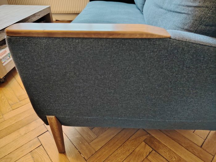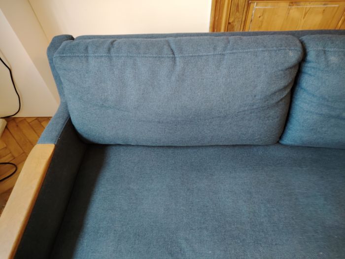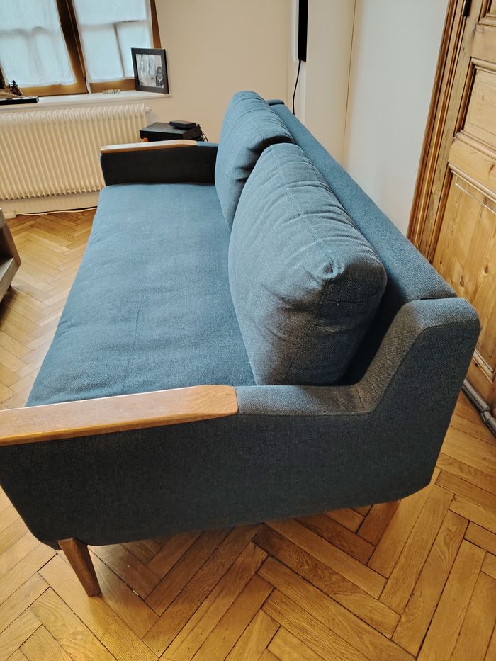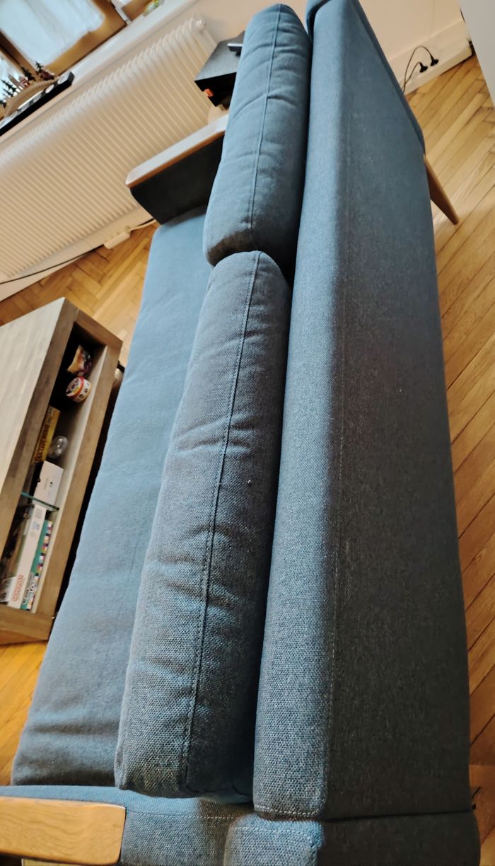Canapé droit 2,5 places en tissu tissé couleur bleu. 2 grands coussins déhoussables pour l'appui du dos. Pieds et manchettes en bois pour plus de style. Dimensions : 188 X 85 X 96 cm. Bon état général. Entièrement nettoyé. Couleur et style pour un salon tendance et très déco. A retirer sur place.