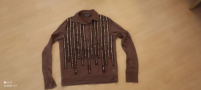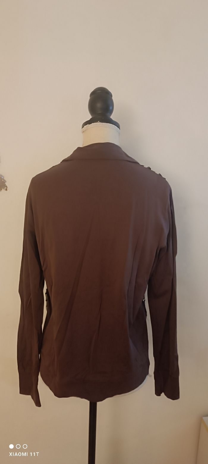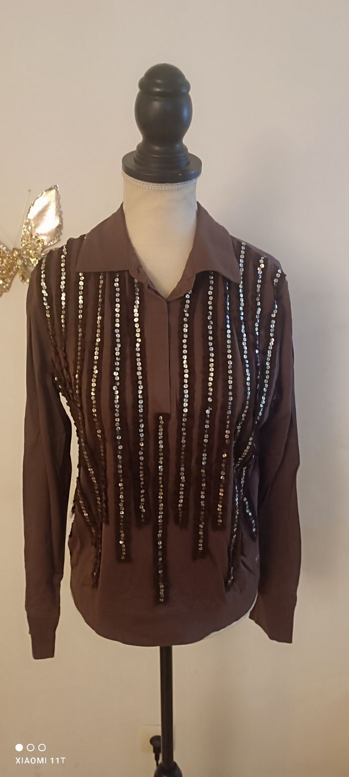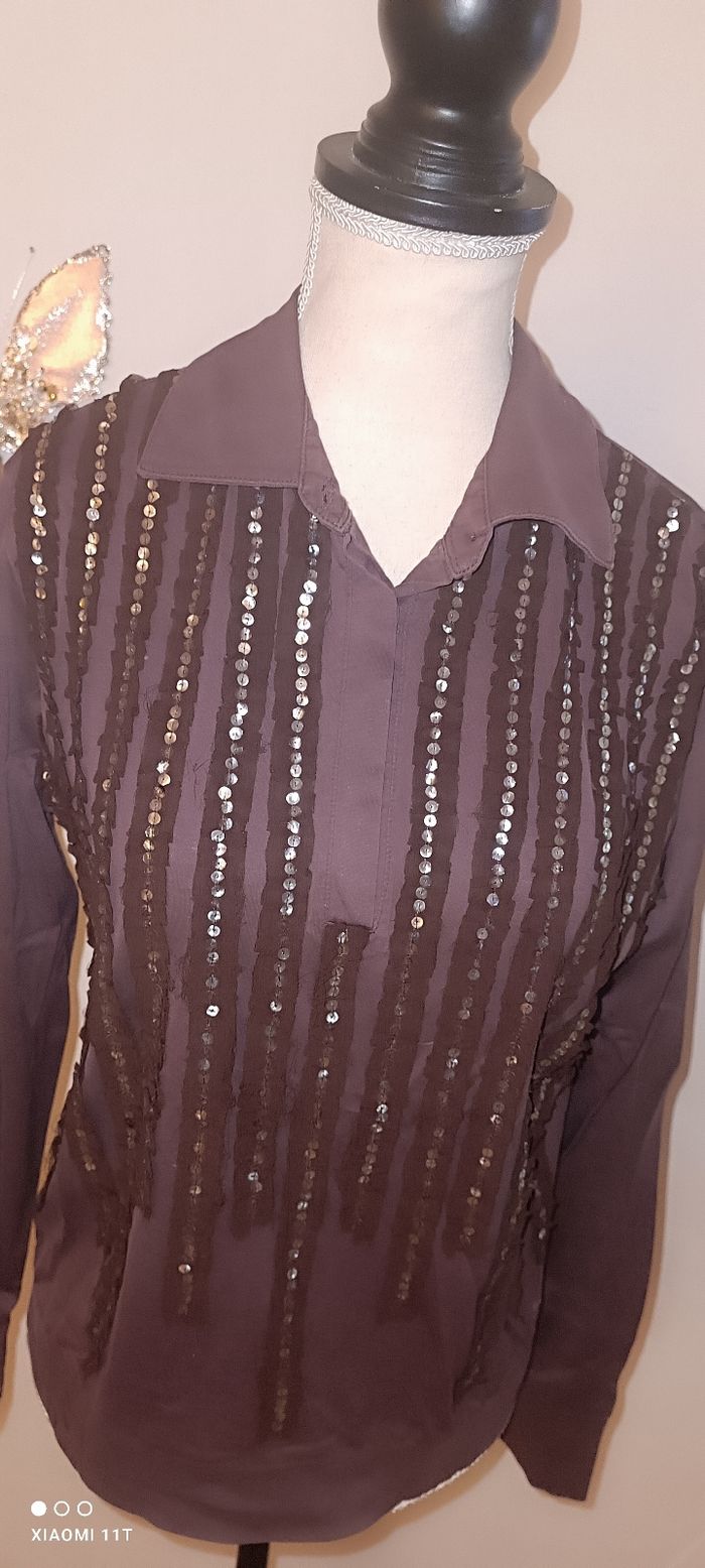 Blouse / chemisier t-shirt femme taille 38 ou 2 EDEN PARK couleur marron bandes en voilage avec sequins argenté manches longues col avec 4 boutons ( + 1 bouton de rechange ) 100% coton longueur totale = 58 cm largeur des épaules = 38 cm largeur aisselles a aisselles = 46 cm Très bon état