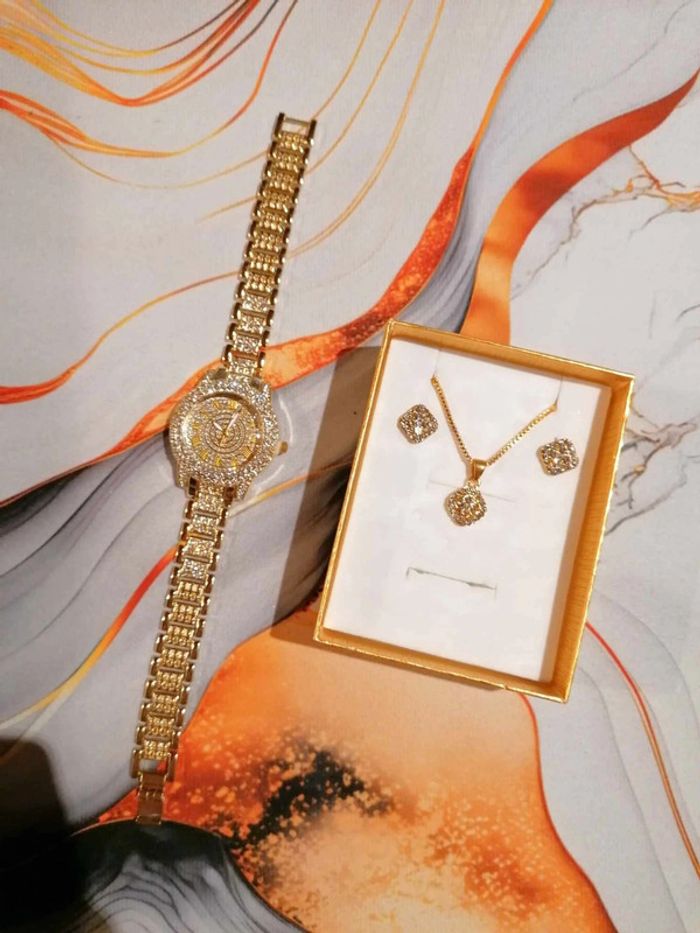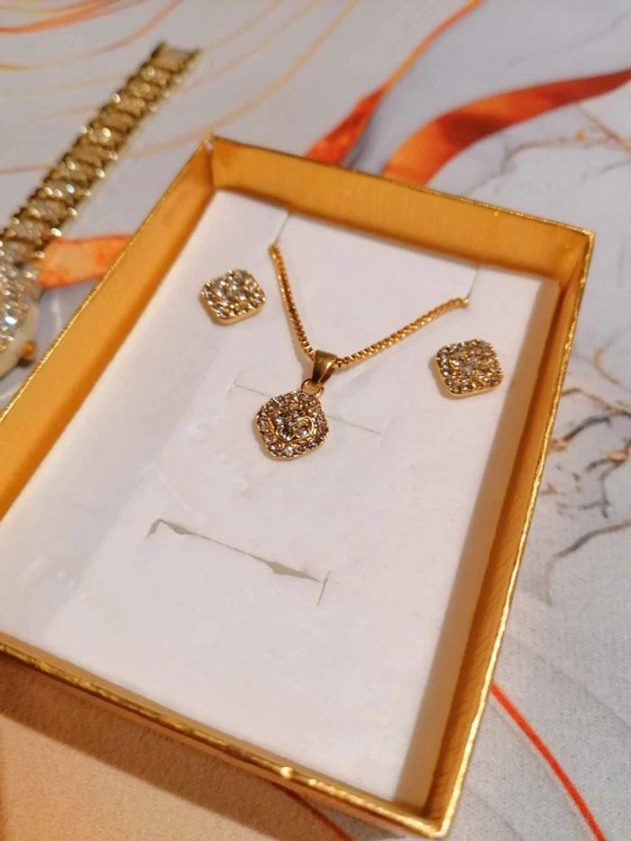 Ensemble bijoux Collier, boucle d'oreille et montre taille 20 cm Couleur Doré Neuf dans boîte cadeau