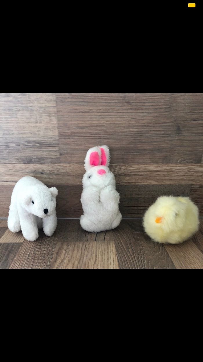 ✨Lot de 3 petites peluches en très bon état 🏷1ère peluche ours blanc de 9 cm de hauteur 🏷2e peluche lapin vintage de 6 cm de hauteur 🏷3e peluche : poussin de 7 cm de hauteur