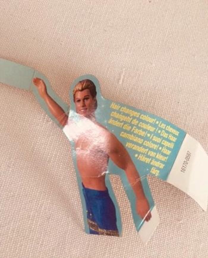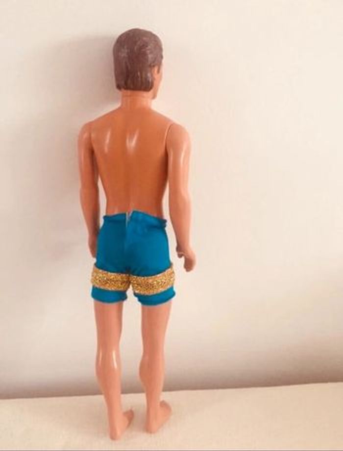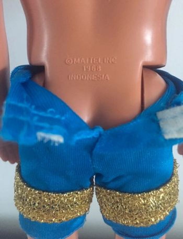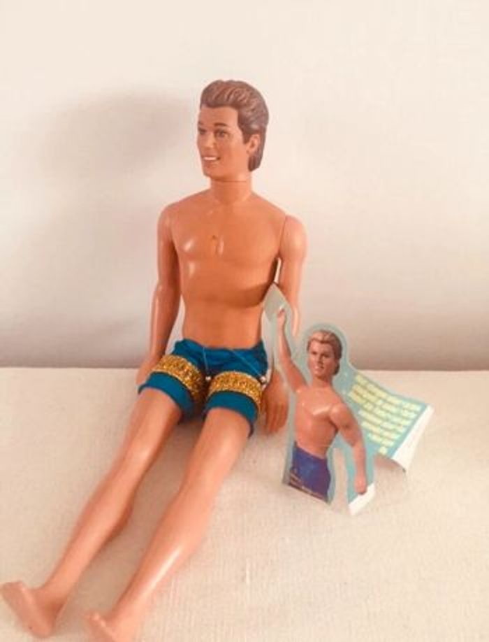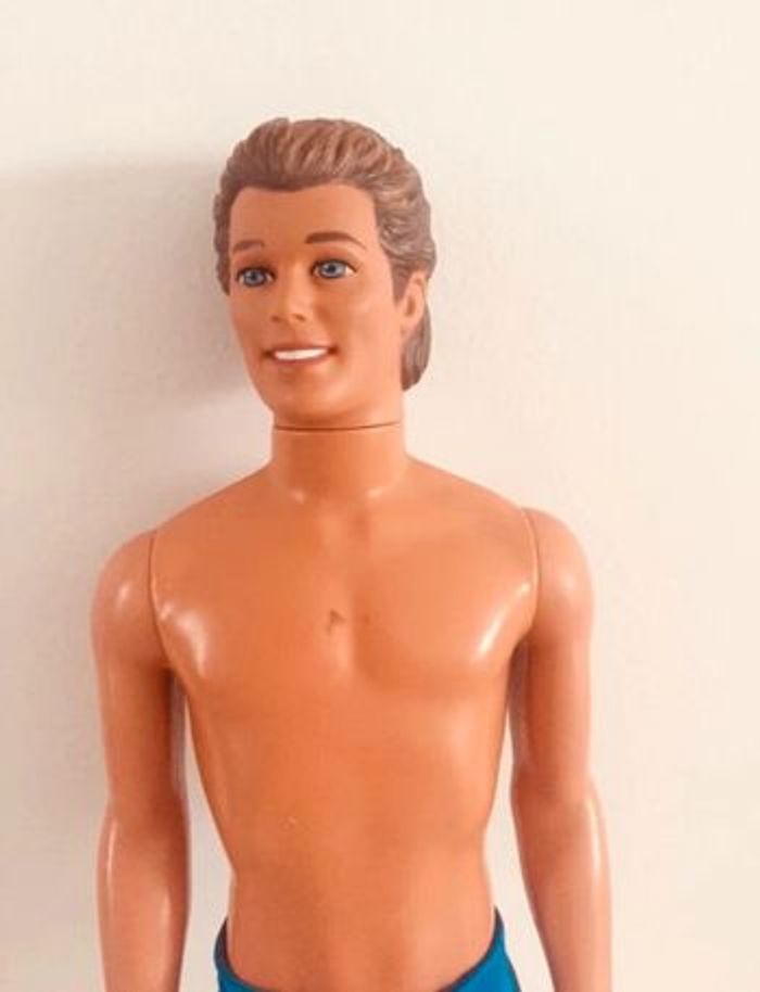 Achat aujourd’hui ? 👉🏻 Départ du 📦 demain ! Poupée mannequin Ken de Mattel avec son maillot de bain bleu et doré Particularité: les cheveux changent de couleur. Écriture bas du dos: 1968 - Mattel inc - Indonesia poupée vintage / vacances / plage / mer / piscine / jouet / enfant / collection / barbie années 90 90´s doll / personnage maison de poupée casa bambola House doll Retrouvez tous les produits barbie que je vends : #barbiemg