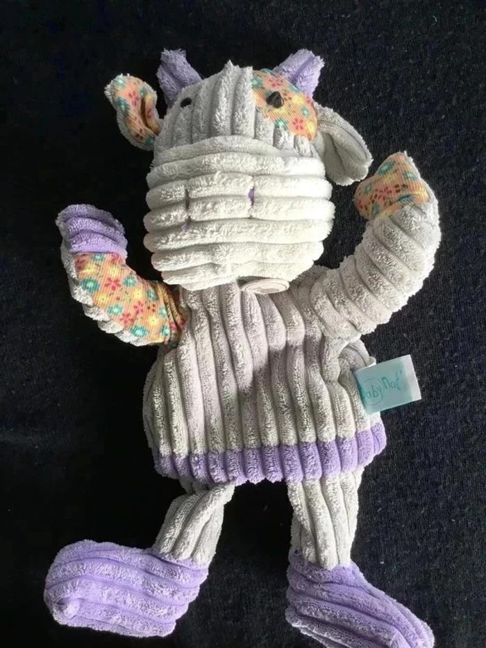 GRANDE MARIONNETTE VACHE QUI MESURE 36CM ELLE EST EN VELOURS COTELE GRIS, VIOLET ET TISSU SAUMON AVEC MOTIFS FLEURS COLLECTION DOUBAMBINS DE BABY NAT ETAT NEUF