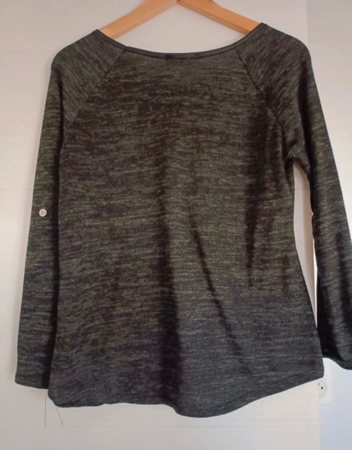 Tee shirt manches longues, Premium Collection, taille S/M. Coloris noir/gris chiné. Matière toute douce. Col et poche aspect cuir. Possibilité de raccourcir les manches grâce à un bouton. Très peu porté. #ccj1367femme