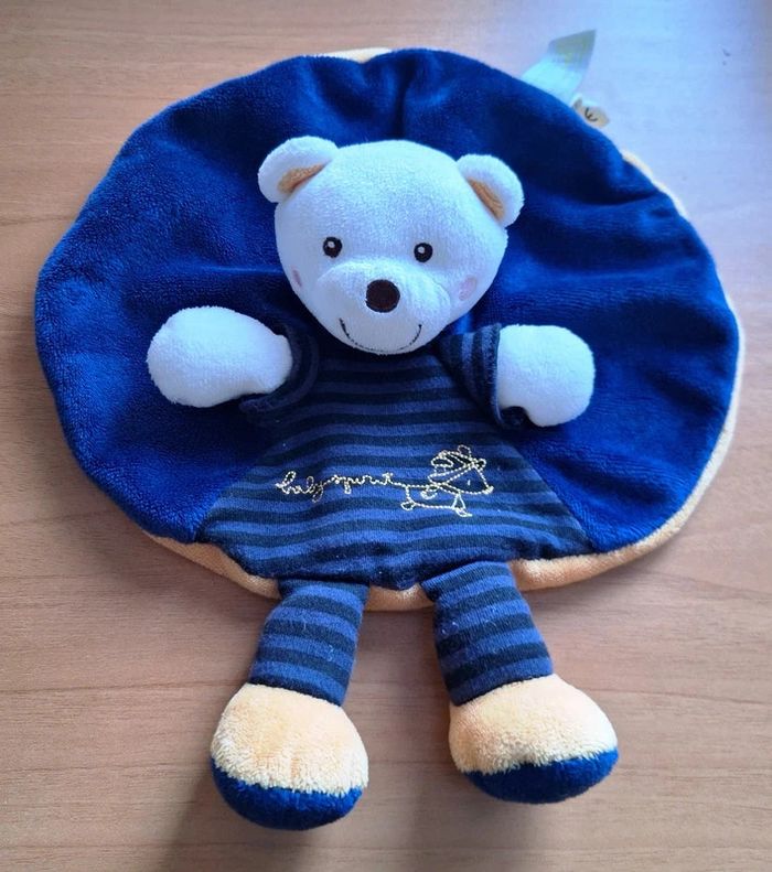 2 DOUDOUS PLATS RONDS EN VELOURS BLEU MARINE SUR LE DESSUS ET ORANGE SUR LE DESSOUS TETE PELUCHE ET BRAS OURS AU CENTRE DU DOUDOU SUR LE DOUDOU EST BRODE EN JAUNE UNE TAUPE ET L'INSCRIPTION "babyspirit" JAMBES RAYEES QUI SORTENT DE L'AVANT DU DOUDOU ETAT PARFAIT !