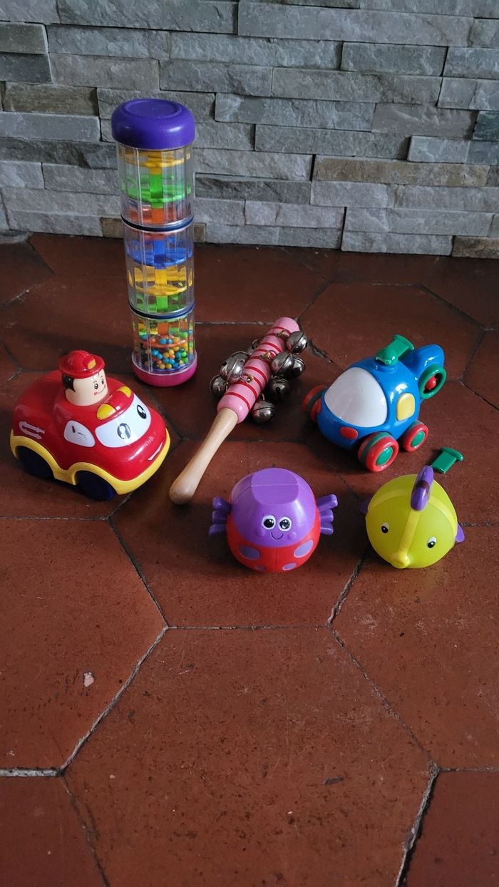 Petit lot de jeux pour petits. Bâton de pluie, hochet, poisson de bain, voiture pompier qui avance seule quand on appuie sur le bonhomme, coccinelle 🐞 & un hélicoptère 🚁 avec pâle à recoller.