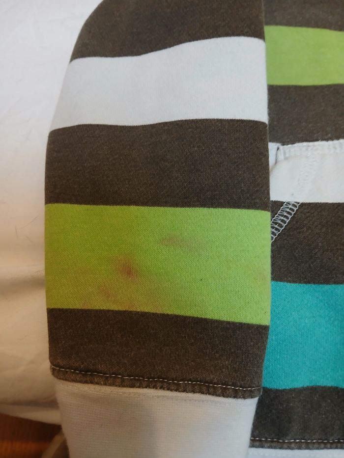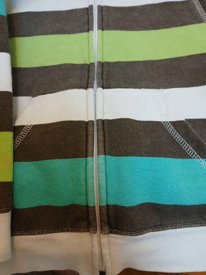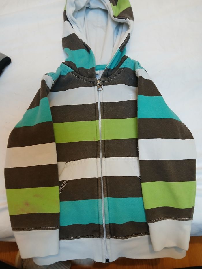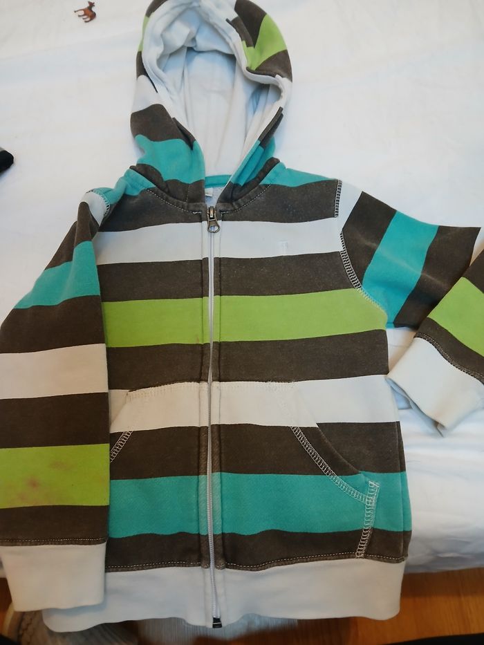 Veste avec capuche, taille bien. Petite tâche à l'arrière de la manche droite.