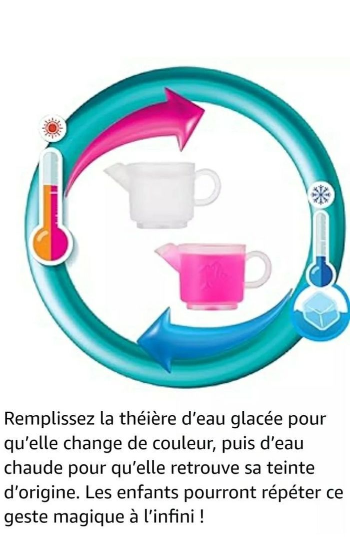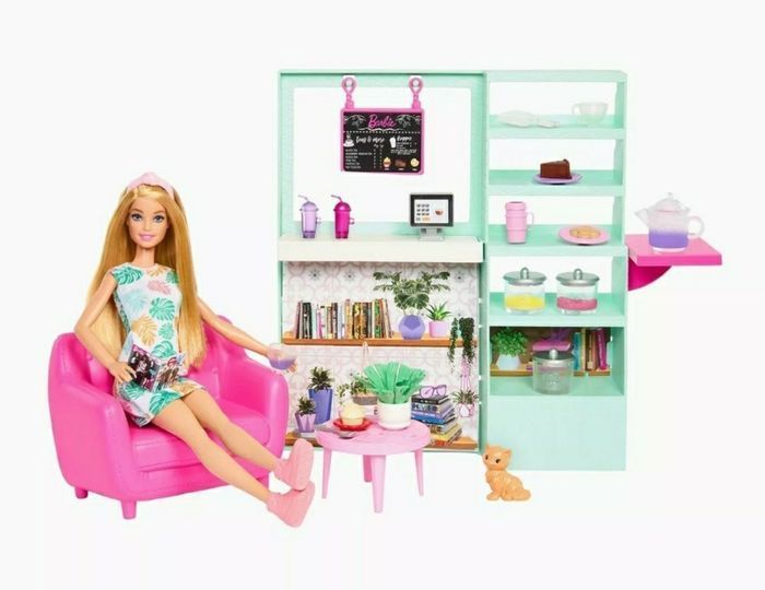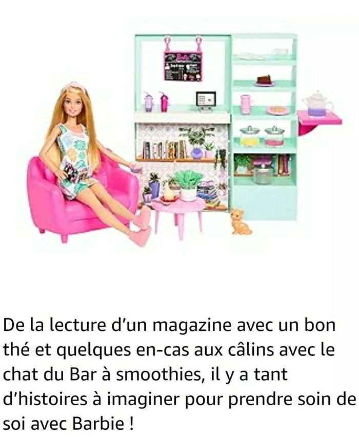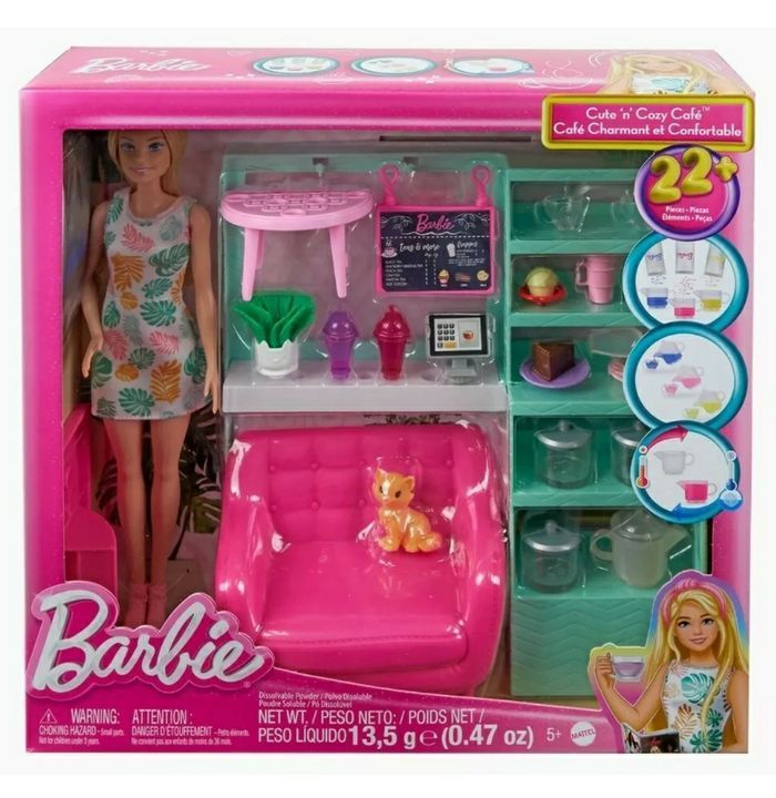 NEUF JAMAIS OUVERT Age : dès 3 ans Dimensions : 33 x 34.5 cm Ce coffret Barbie inclut une poupée, du mobilier et 21 accessoires de jeu  dont un qui change de couleur  La poupée Barbie, aux longs cheveux blonds, porte un serre-tête rose, une adorable robe à imprimé feuilles et des bottines roses. Elle est accompagnée d’un adorable chaton qui la suit partout. Elle peut se passer commande au bar et se détendre dans le fauteuil tout en feuilletant un magazine, ou préparer elle-même de délicieuses boissons  Déposez une cuillerée de papier soluble (bleu, rouge ou jaune) dans la théière qui change de couleur. Ajoutez de l’eau pour créer des boissons fictives  Mélangez les couleurs pour encore plus de possibilités ; même la théière change de couleur lorsque vous la remplissez d’eau glacée.