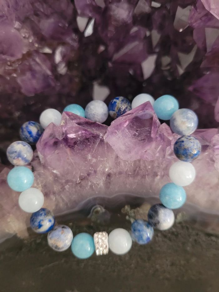 Neuf. Énergie positive Perles de 8 mm de sodalite, lapis lazuli, angélite bleu, quartz. Perles d espacement en acier inoxydable. Environ 18 cm linéaire. Je peux rajouter1 ou 2 perles. #isabo66_bijoux