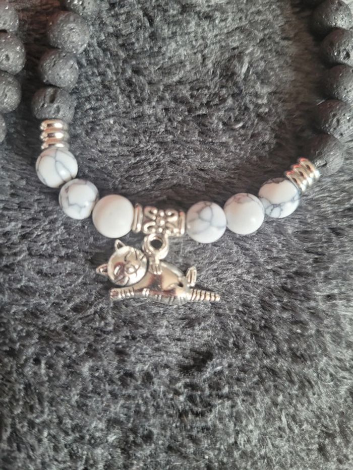 Neuf Perles véritables de lave de volcan et Howlite 6 mm. Chat et perles d espacement en acier inoxydable. 15 cm linéaire. Longueur voulue à préciser si plus petit ou plus grand souhaité.