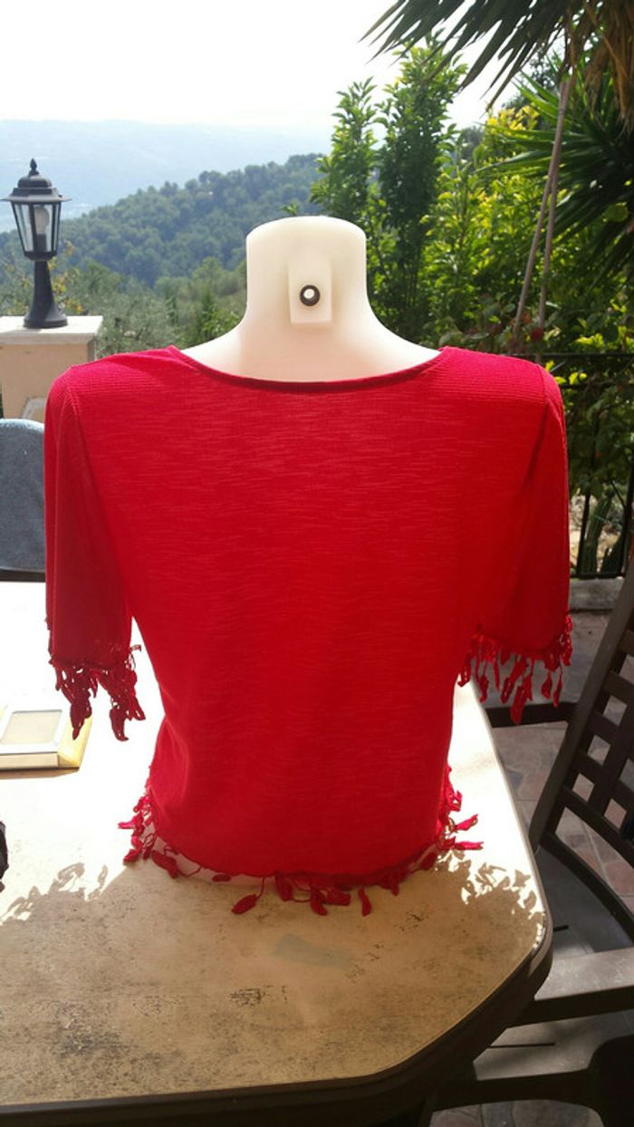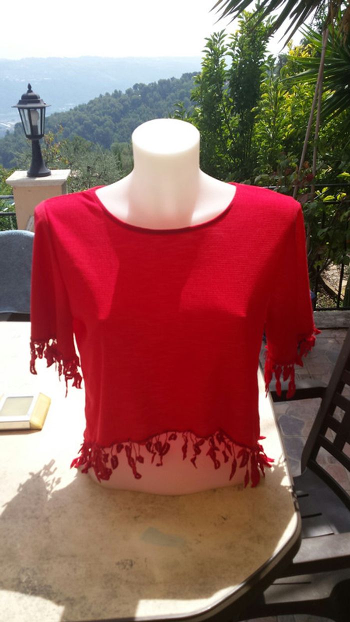 Très joli haut rouge à franges. Découpe plus courte devant. Manches courtes. Coton. TBE #isabo66_vetementsfemmes