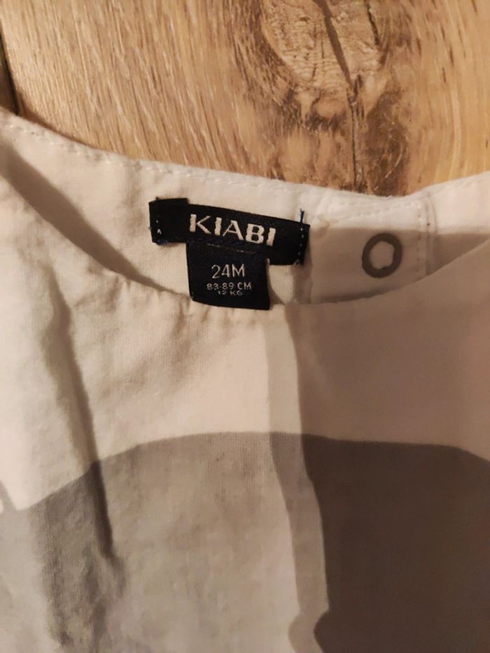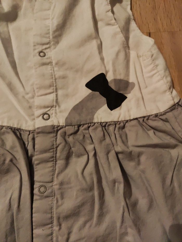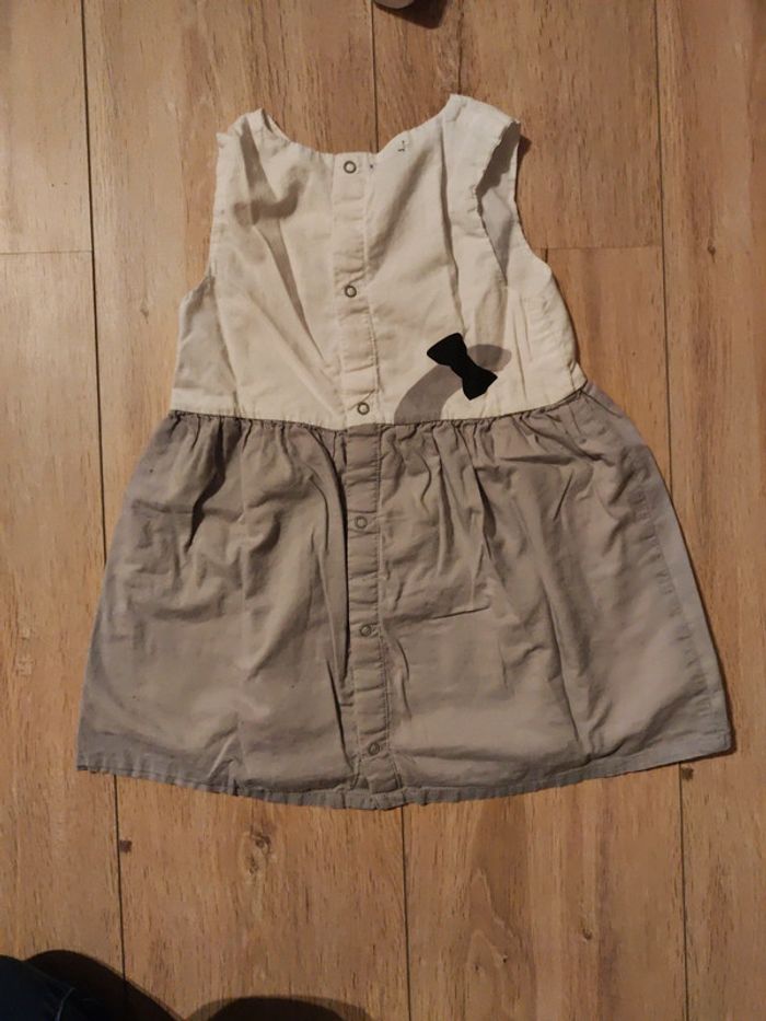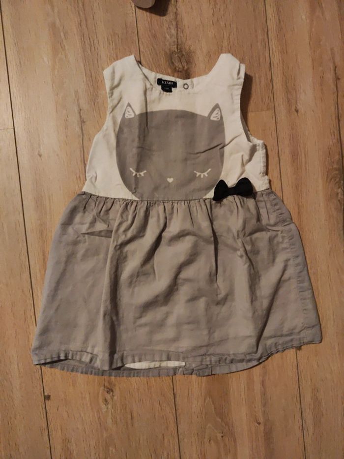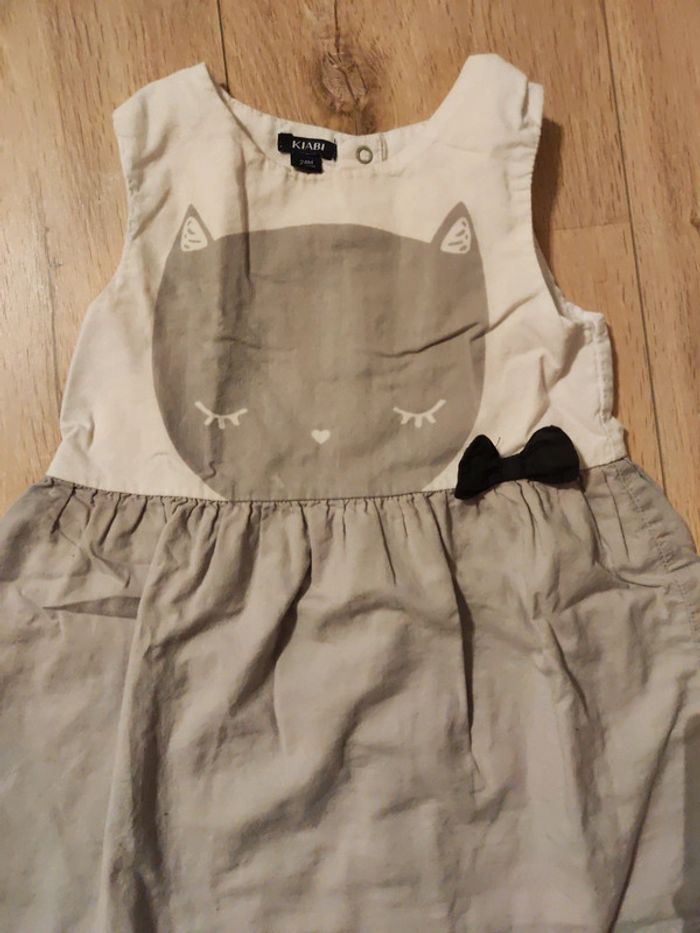 Robe été grise et blanche, pression dans le dos , tête de chat avec un petit noeud et queue derrière, doublé en bas, taille 2ans marque Kiabi