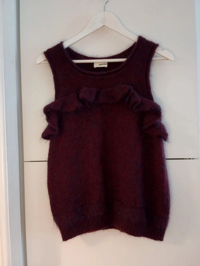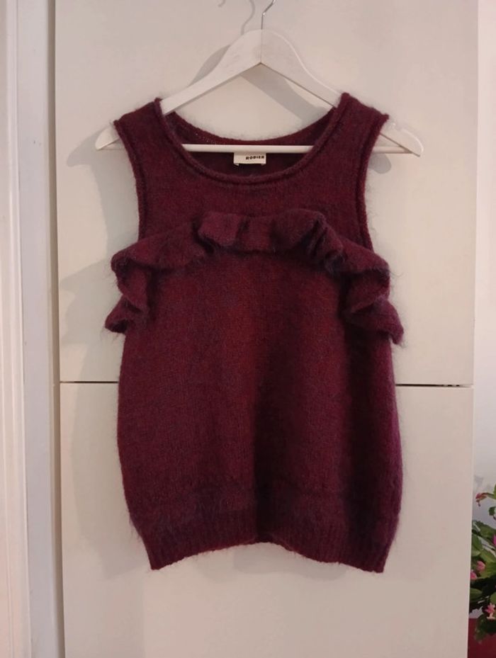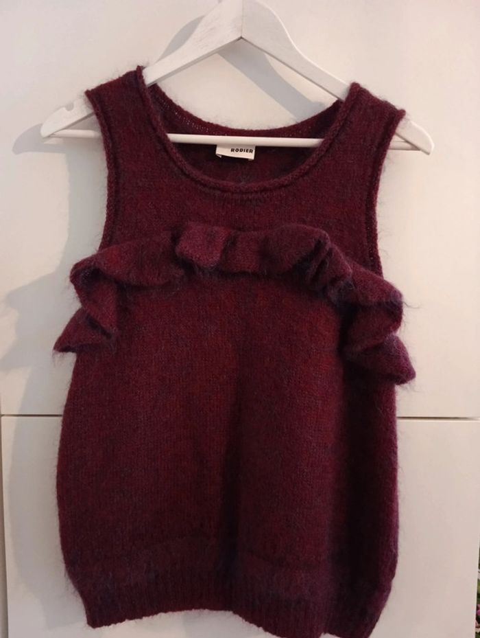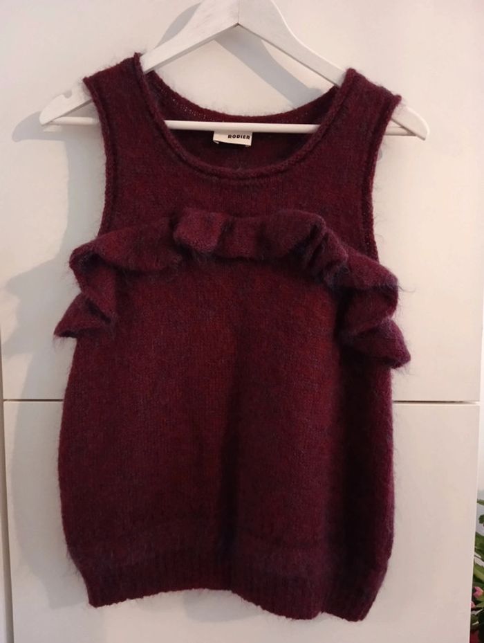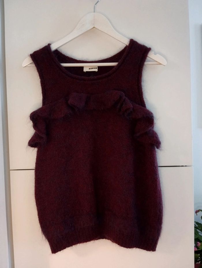 Pull sans manches volanté bordeaux reflets bleus Rodier. Il n'y a plus d'étiquette de composition mais contient de la laine. Taille 38 /40 à confirmer avec les mesures Epaules 34cm Aisselles 48cm Longueur 61cm