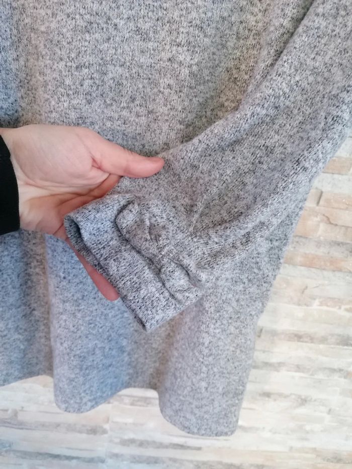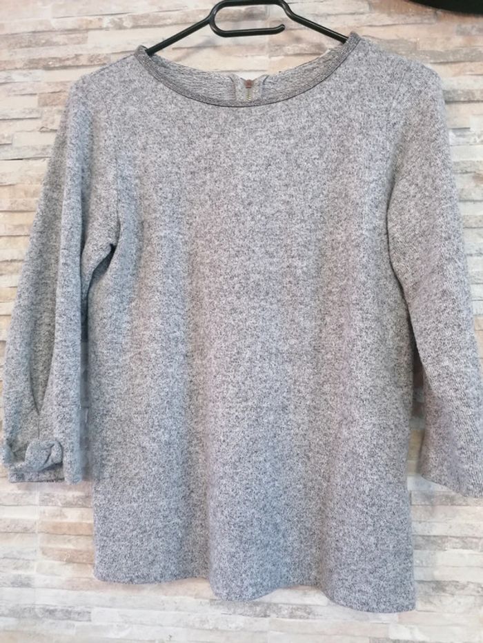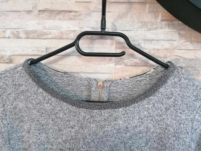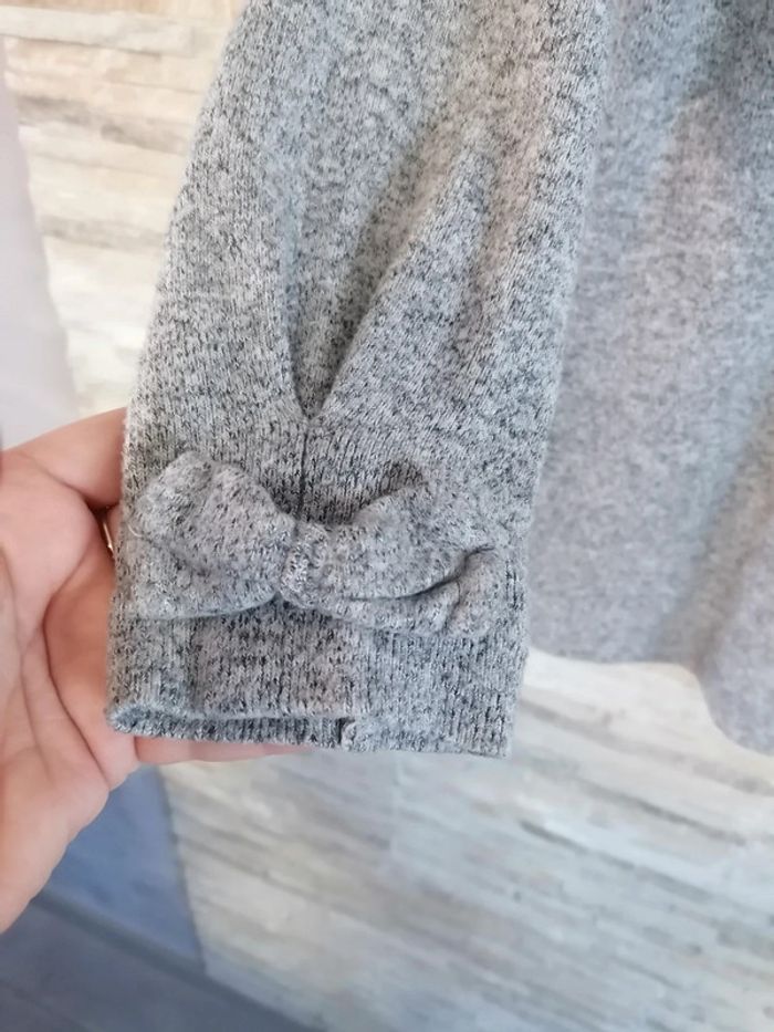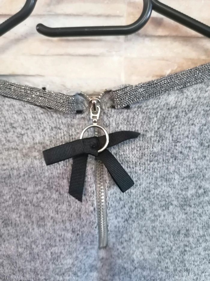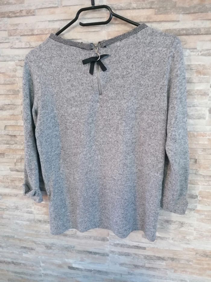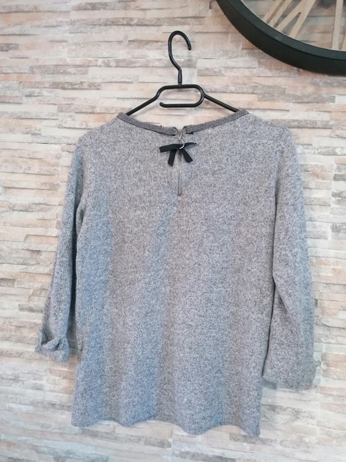#Vêtements_femmes_krocaro Pull gris Avec Liseré brillant col Et nœud sur manches 3/4(arrive avant coude). Taille M De marque naf naf Déjà porté.