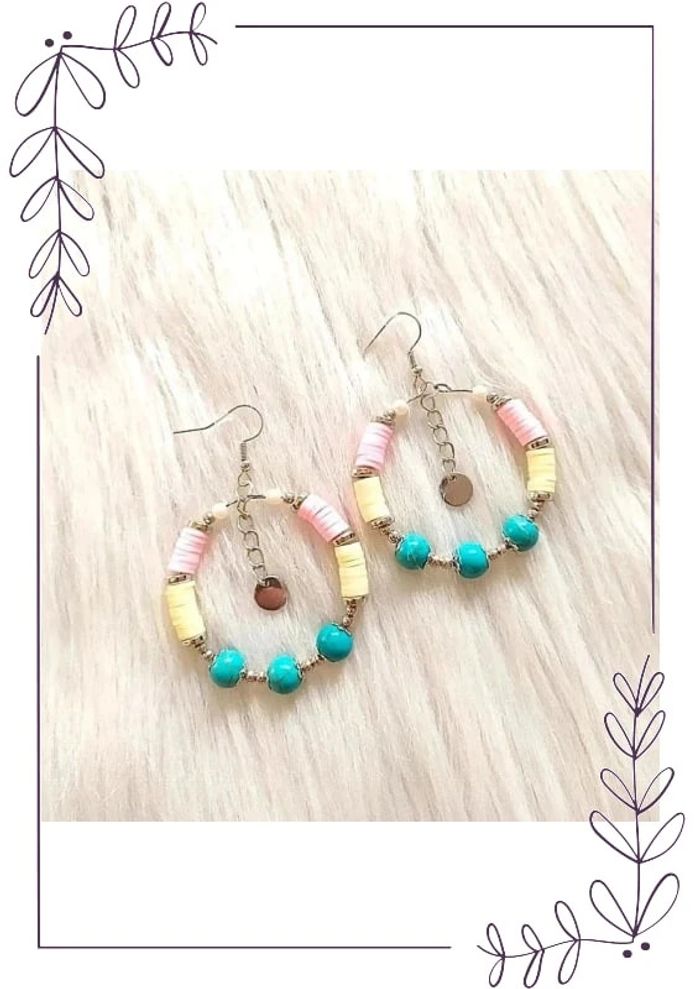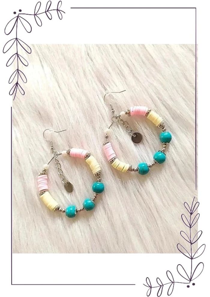 #cencovbijoux Boucles d'oreilles anneaux créoles avec perles façon turquoise et perles heishi Longueur 6,5 cm. Diamètre 4,5 cm. Neuves