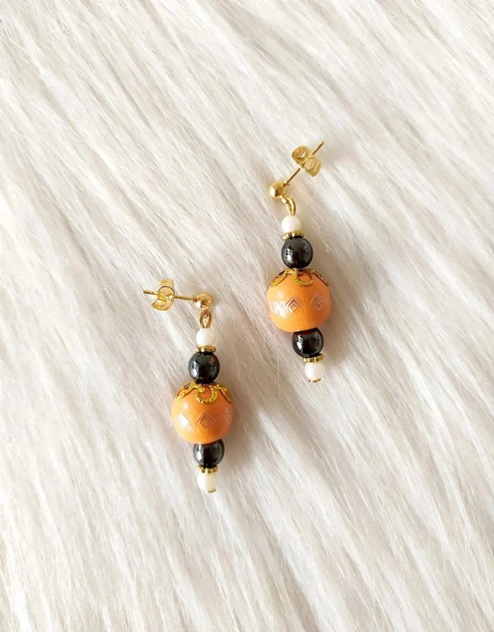 Boucles d'oreilles pendantes boules perles en bois+ hématite