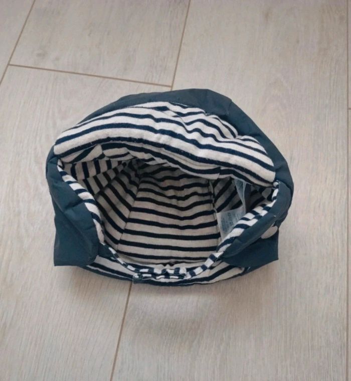 Bonnet forme chapka, permet de bien protéger les oreilles de bébé. Visière et intérieur doublés de jersey doux. Brides pressionnées au niveau des caches oreilles. ⚠️ Il est indiqué 3 ans sur l'étiquette mais taille petit donc plutôt 12/24 mois. #ccj1367garçon12mois #ccj1367garçon18mois #ccj1367garçon24mois