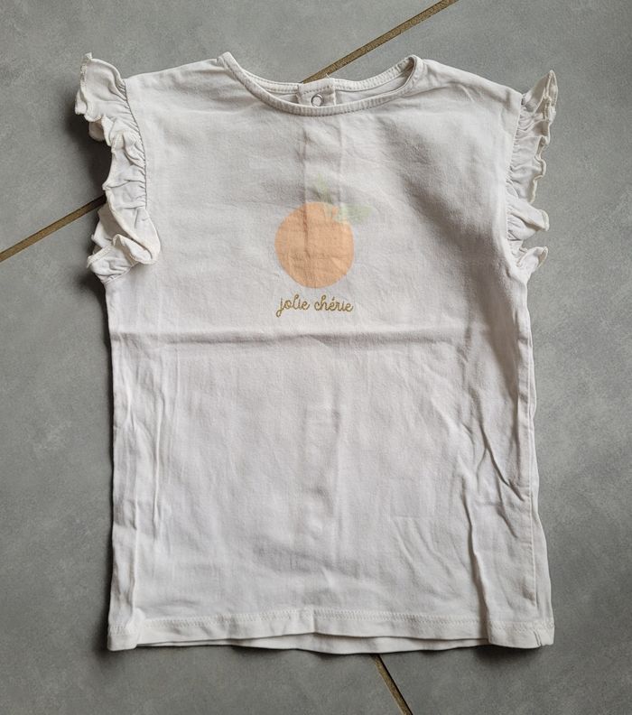 T-shirt manches courtes, de couleur blanc avec motif, de la marque Kiabi, taille 24 mois (83-89 cm), en très bon état. Article lavé pour la vente.