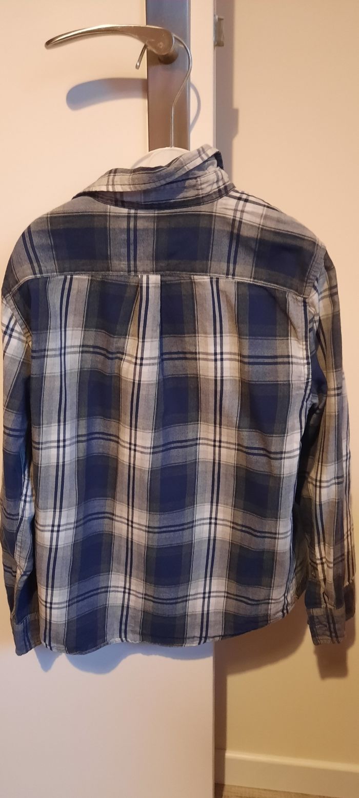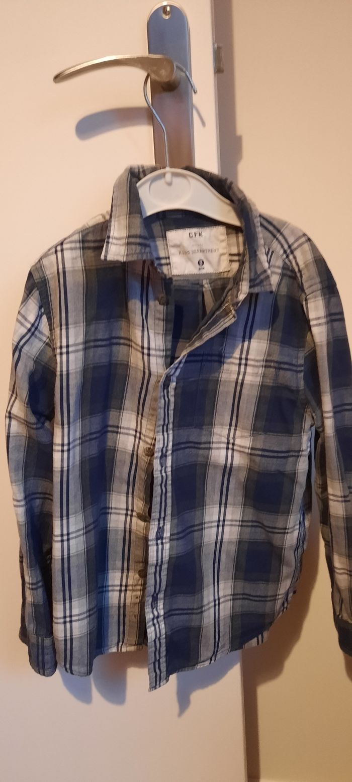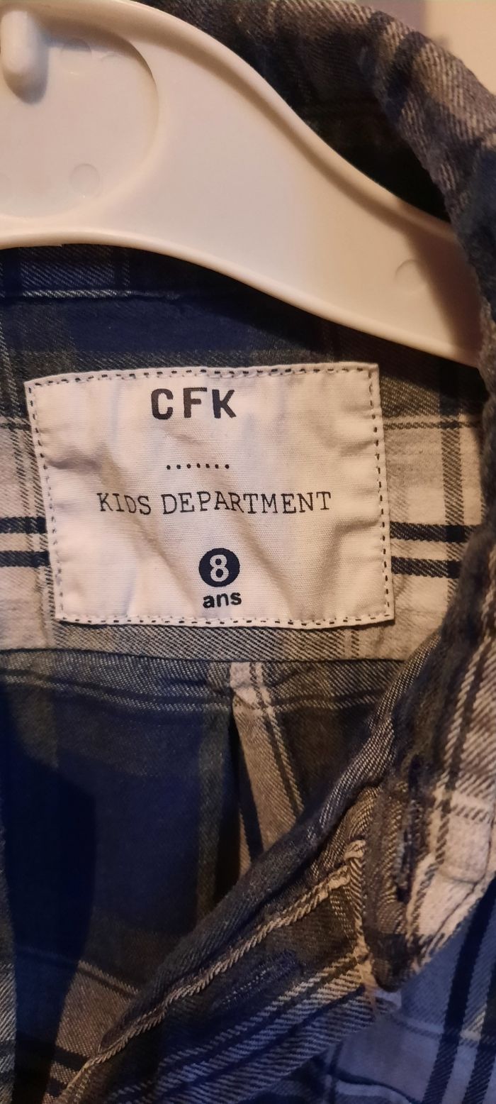 Chemise manches longues, taille 8 ans, 100% coton avec poche sur la poitrine, marque CFK en très bon état. Il y a juste une partie du bouton de manchette qui est cassé (cf photo).