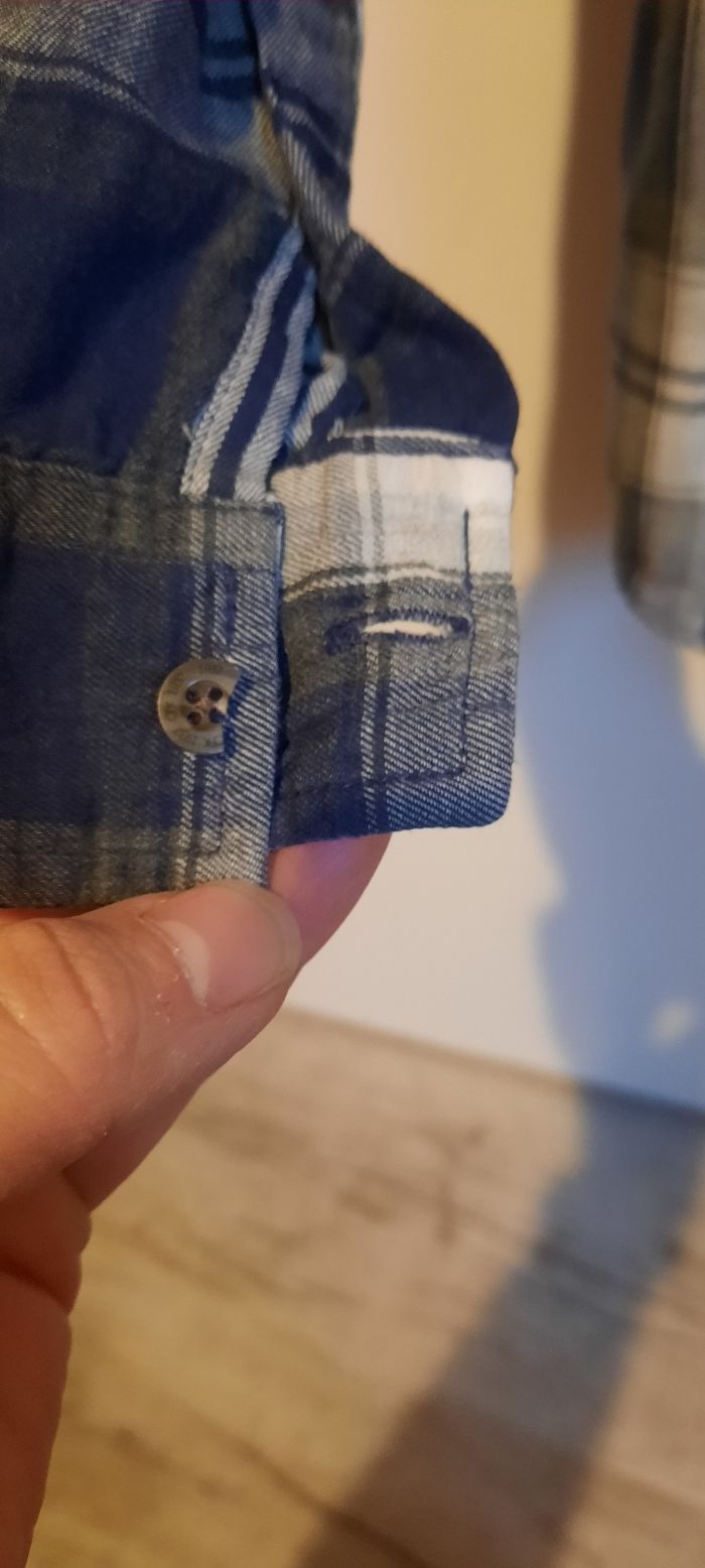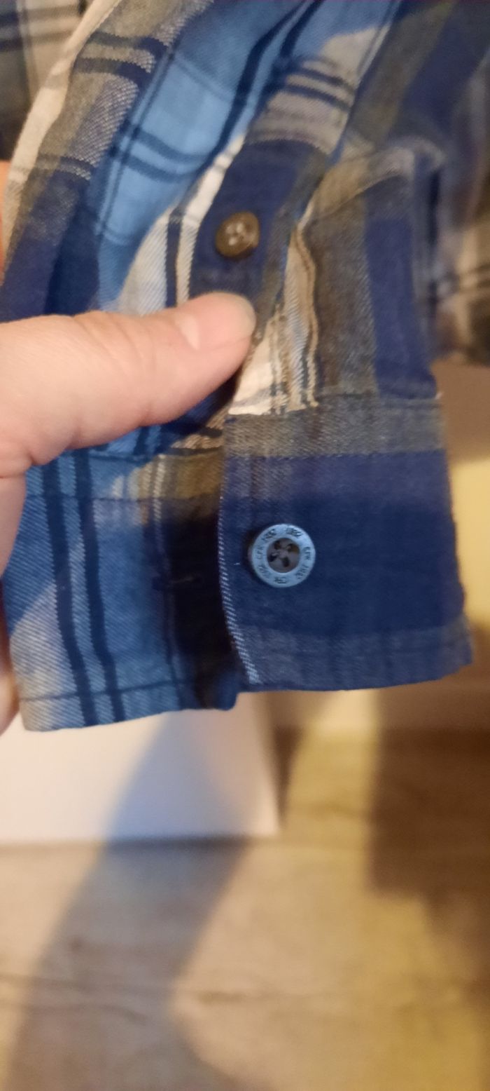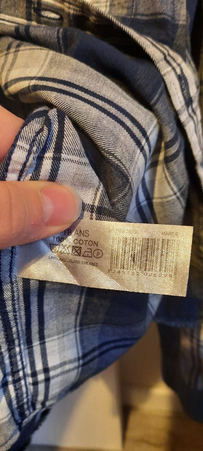 Chemise manches longues, taille 8 ans, 100% coton avec poche sur la poitrine, marque CFK en très bon état. Il y a juste une partie du bouton de manchette qui est cassé (cf photo).
