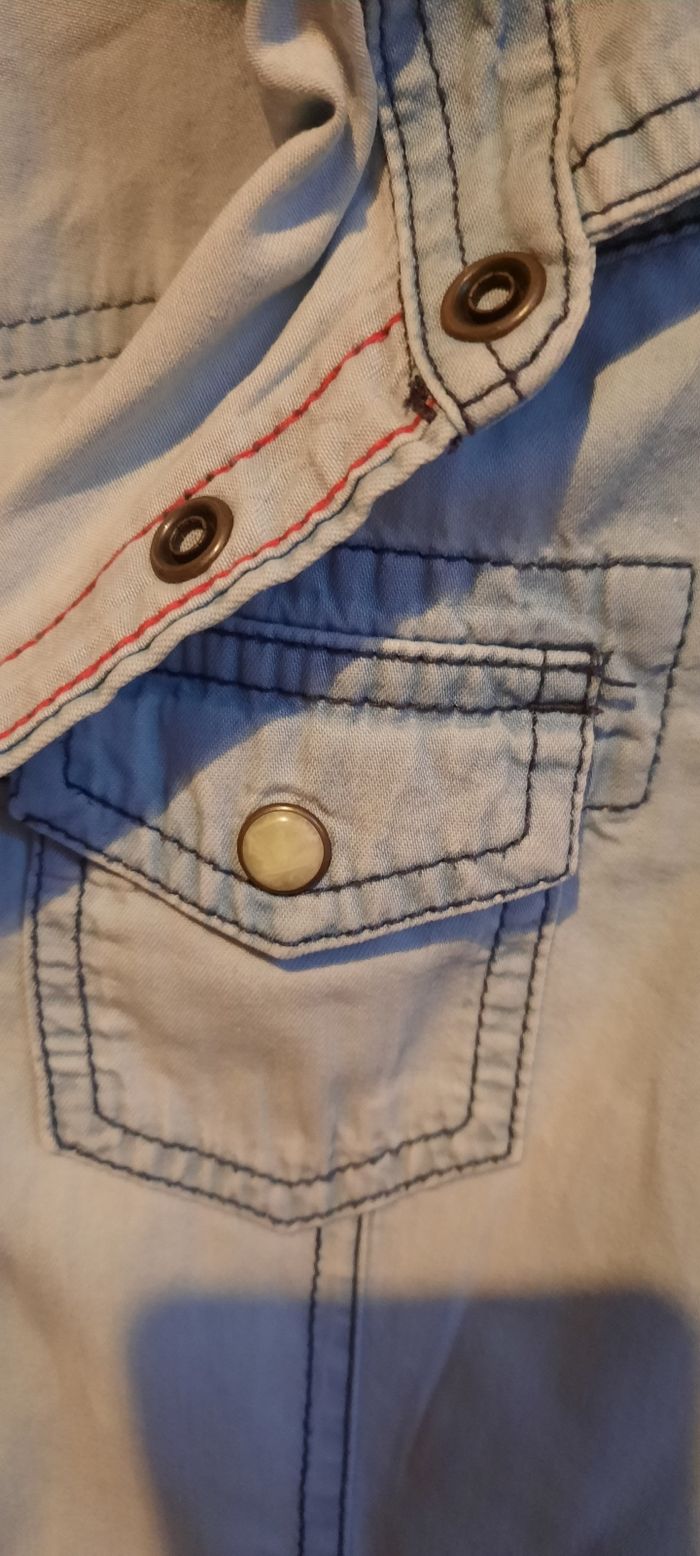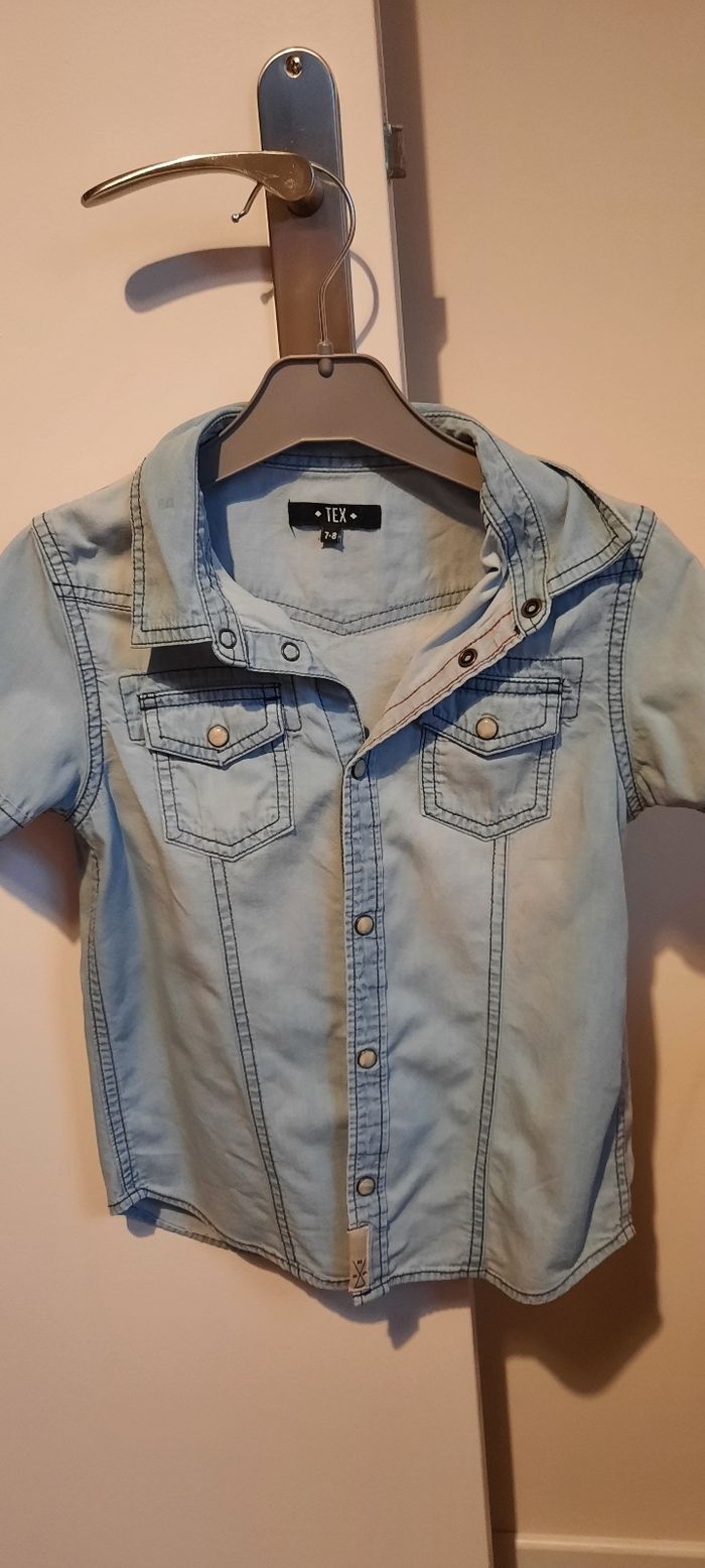 Chemise manches courtes taille 7/8 ans, marque TeX en très bon état avec 2 poches sur la poitrine. Boutons pressions.