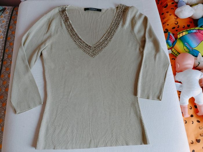 Top manches 3/4 côtelé perles col en v - photo numéro 1
