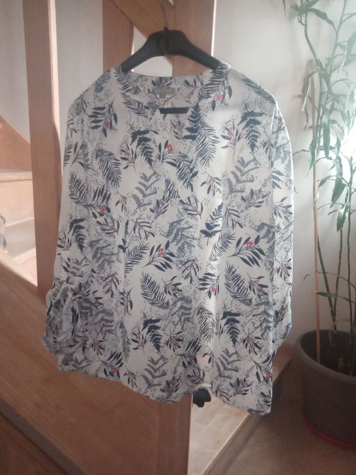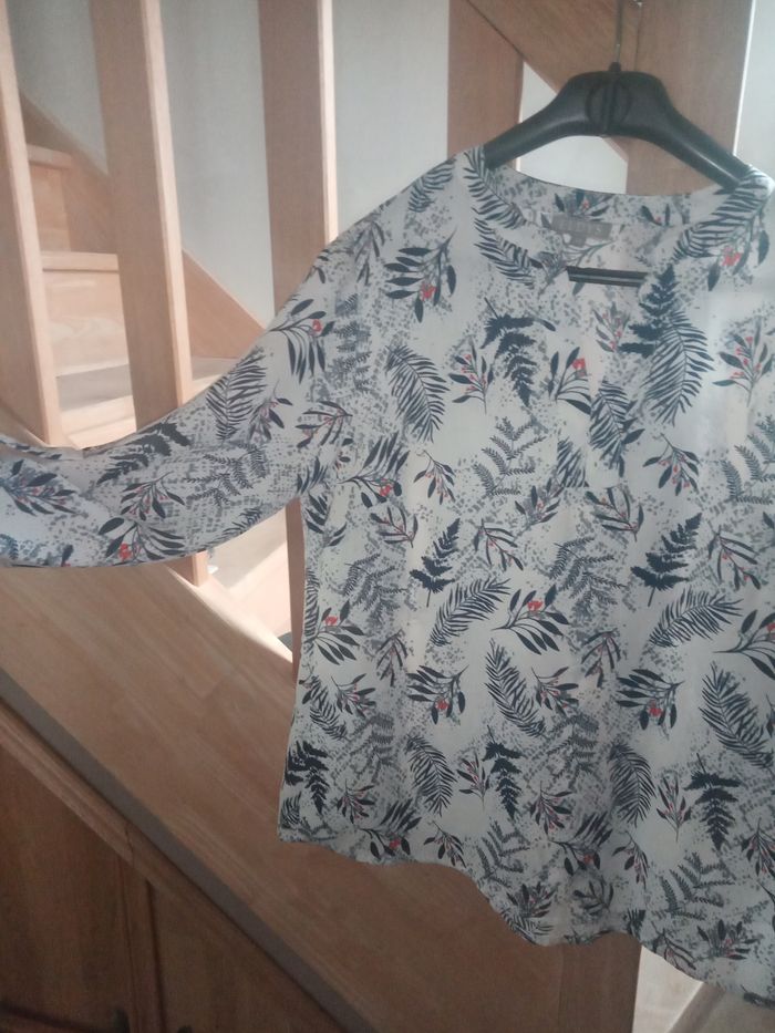 Joli Petit Haut Taille 38 "Eldys" Couleur: Blanc avec motifs Bleus Marines, Gris et Rouges Manches Longues pouvant se retrousser avec attache Style élégant et fantaisiste Dimensions: Longueur totale 63,5cm - Longueur manches 58cm - épaule à épaule 41cm - Aisselle à aisselle 50cm Matière: 100% Polyester Haut en parfait état, comme Neuf, porté 1 fois (vendu comme sur les photos)
