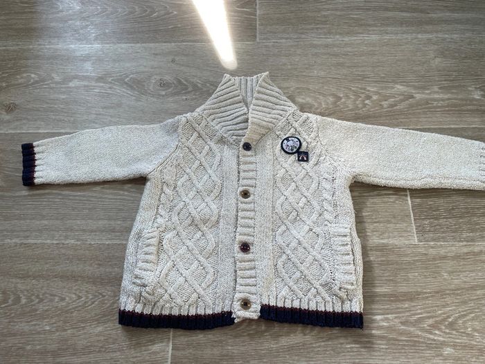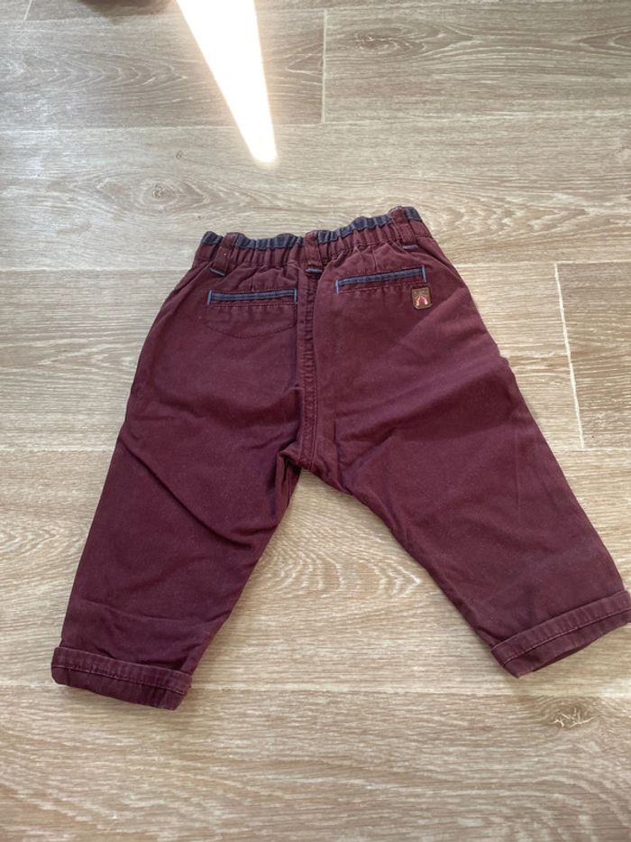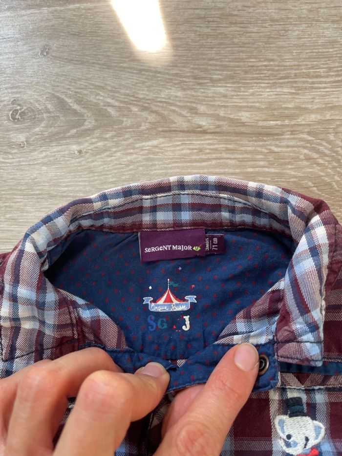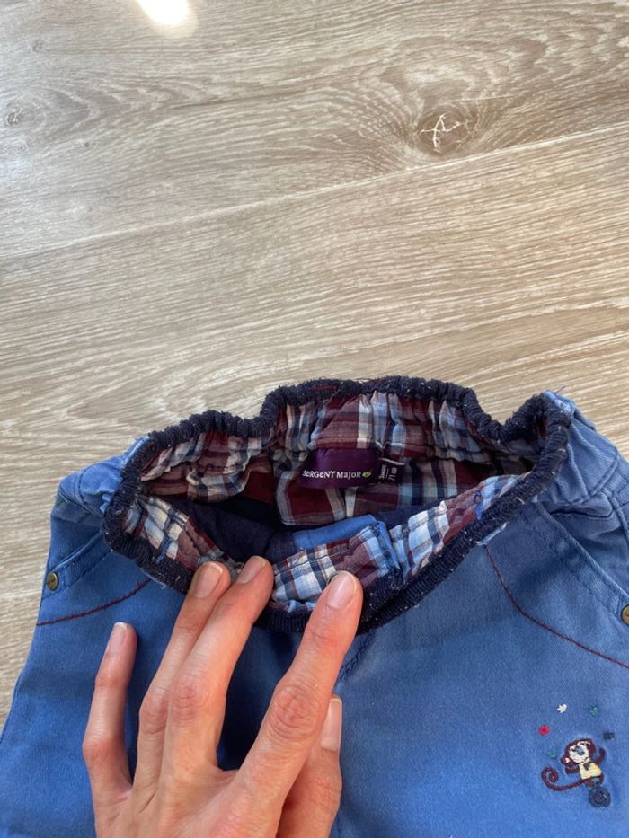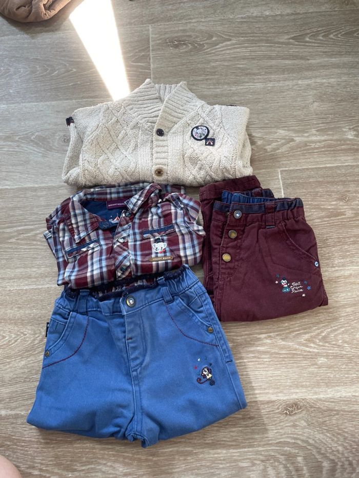 Ensemble sergent major taille 9 mois en très bon état comprenant 4 pièces : - un pull beige a grosse maille - un pantalon Bordeaux - un pantalon bleu épais - une chemise à carreaux Sur le thème du cirque