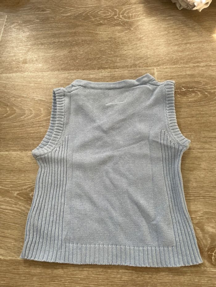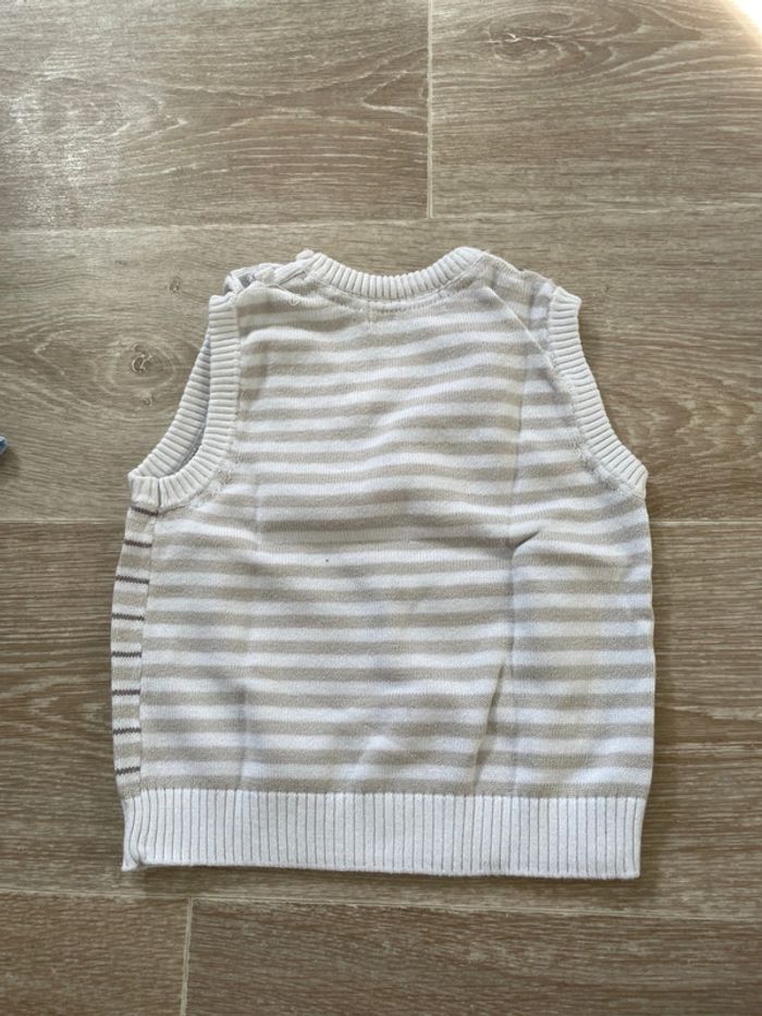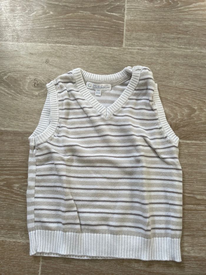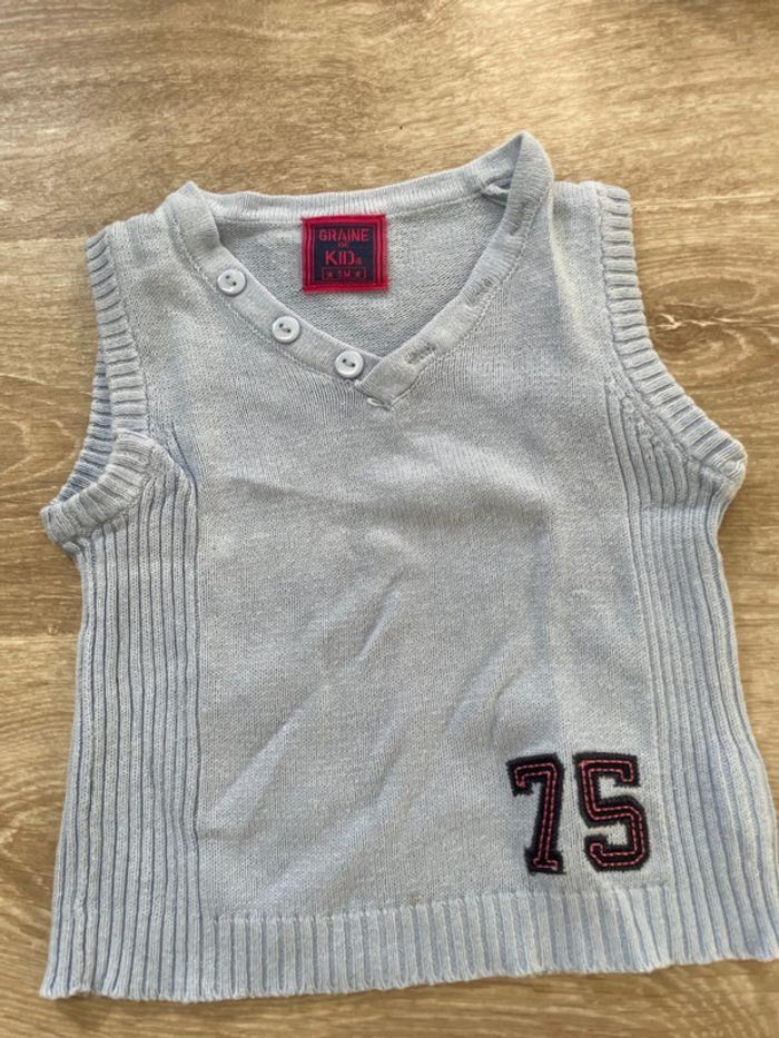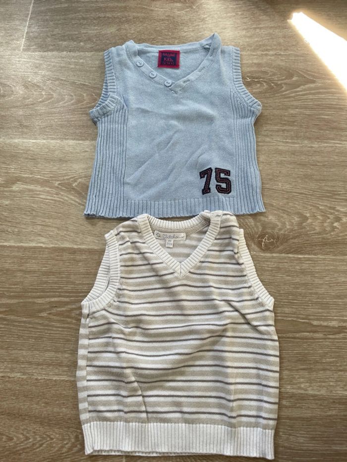 Lot de deux pulls sans manches taille 9 mois de la marque kitchoun et graine de kid . Un bleu ciel en très bon état hormis une petite tache (voir photo) et un beige en très bon état