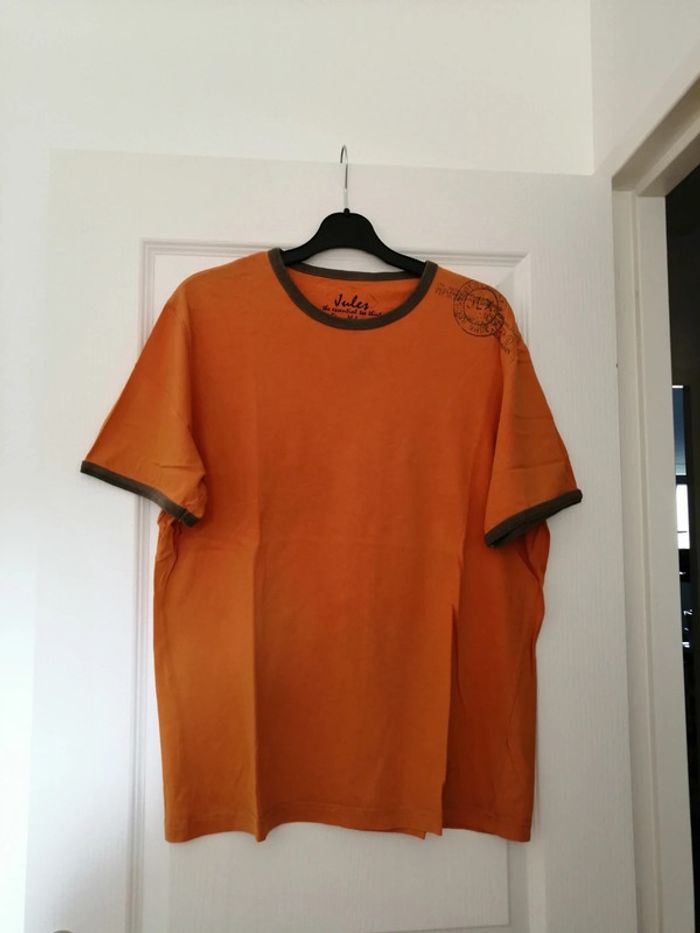 Tee shirt de la marque Jules en très bon état, couleur orange et gris, col rond et taille XL.