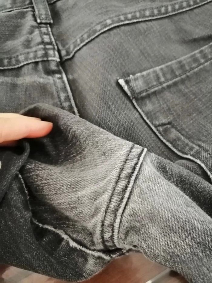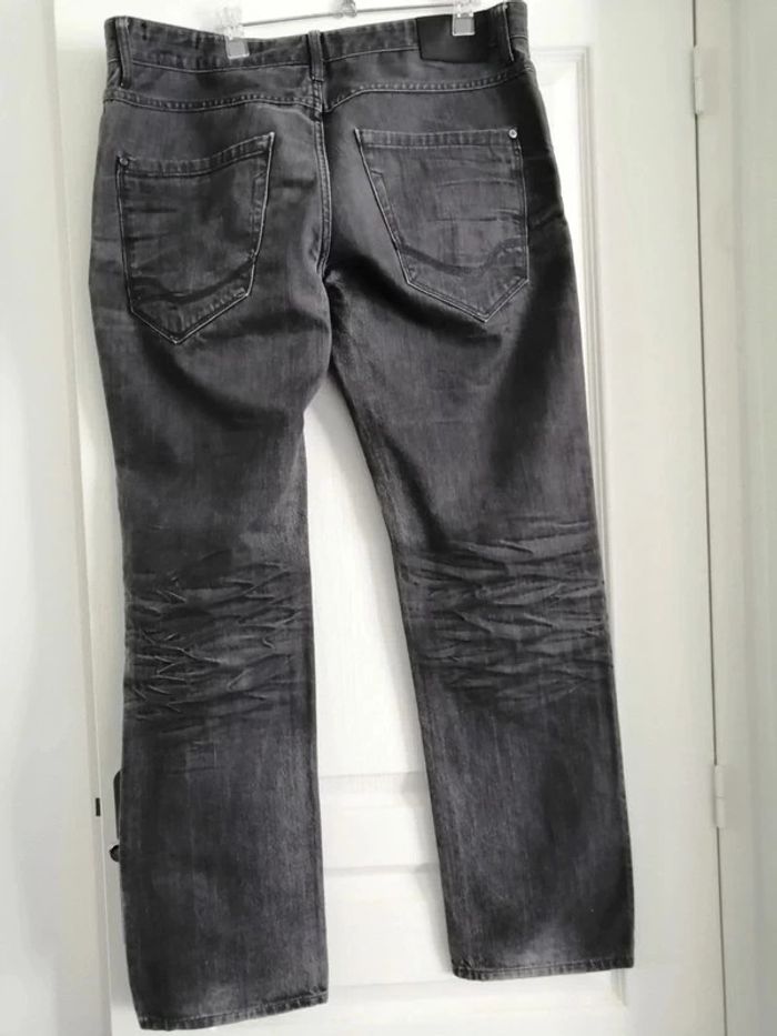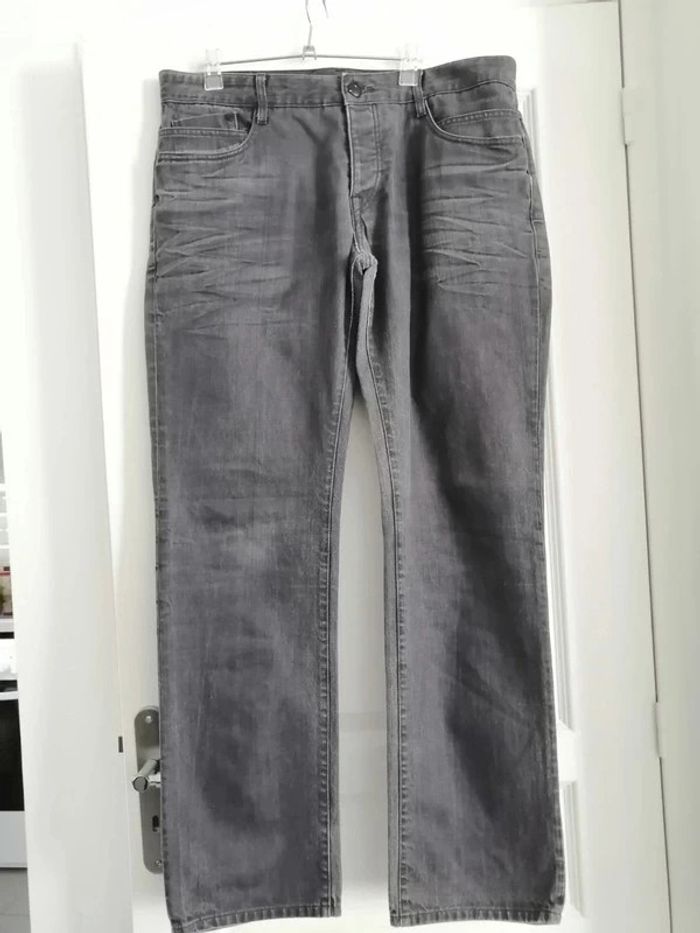 Jean gris de la marque Jules, en bon état (traces d'usure à l'entrejambe, voir photo). Coupe straight, taille 46. Fermeture à boutons, peinture sur le boutons qui s'enlève légèrement