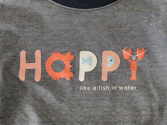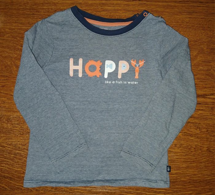 Tee-shirt manches longues. Pression au niveau du col. Dessin marqué happy. Taille 36 mois. Marque obaibi. #teeshirtmancheslongues #teeshirtenfant #obaibi #taille36mois