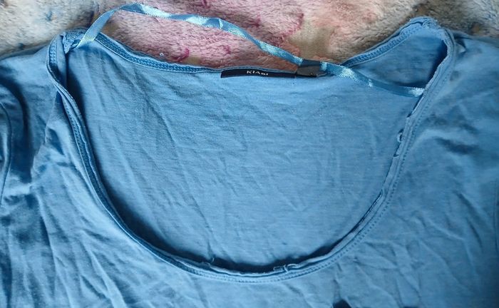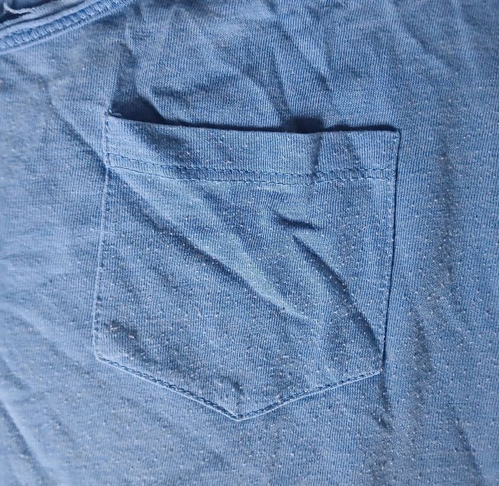 Tee-shirt bleu clair. Manches courtes. Col rond. Poche décorative. Le tour du col est style déchiré (acheté comme ça). Marque kiabi. Taille 42. #teeshirt #teeshirtmanchescourtes #bleuclair #taille42 #kiabi